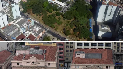 Le Pátio do Colégio est la place où se situait le collège construit par les Jésuites en 1554, l'acte fondateur de la ville de São Paulo. Il est peu visible sur l'image satellitaire, comme tout le centre historique mais en vue aérienne ou du haut des immeubles voisins (Fig. 13), on perçoit bien en quoi cette place résume l'histoire de la ville : alors que les bâtiments initiaux - remis dans leur état initial présent longtemps abrité le palais du gouverneur - étaient de style portugais, ceux qui les jouxtent au Nord, construits au XIXe siècle, sont de style néoclassique européen et les gratte-ciel qui lui font face sont clairement inspirées de modèles nord-américains.