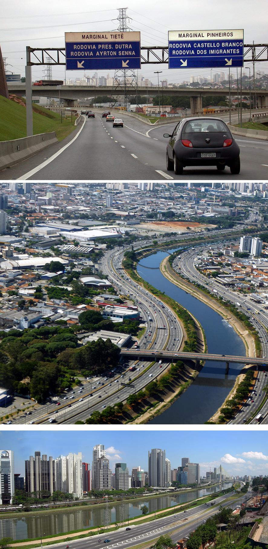 Pour y remédier, on a d'abord aménagé des voies sur berges : les deux Perimetrais aux bords des rios Tietê et Pinheiros. Puis, plus récemment, un vaste anneau autoroutier - le Rodoanel – a été construit (Fig. 9).