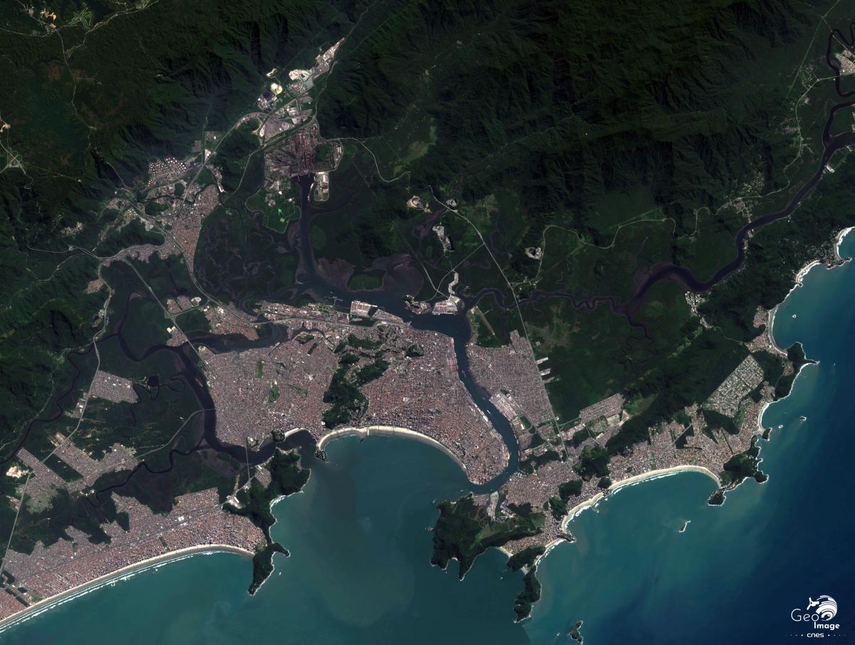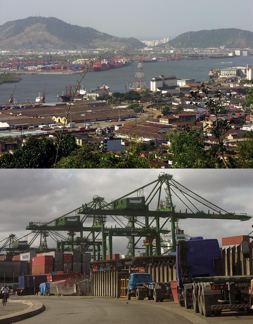 Le port de Santos est de loin le principal du pays. C'est par lui que transitent les approvisionnements des 22 millions d'habitants de la ville, et la plupart de ceux des 40 millions des habitants de l'État. Il a été progressivement équipé et étendu pour répondre à une demande croissante, avec des zones équipées pour le transit du vrac solide, du vrac liquide et des conteneurs (Fig. 28). Les extensions portuaires se sont déjà étendues à quelques-unes des îles situées en arrière du port de Santos, comme celle de Barnabé, alors que d'autres sont encore inoccupées ont servi de lieu de décharge pour les industries qui se sont installées près du port.