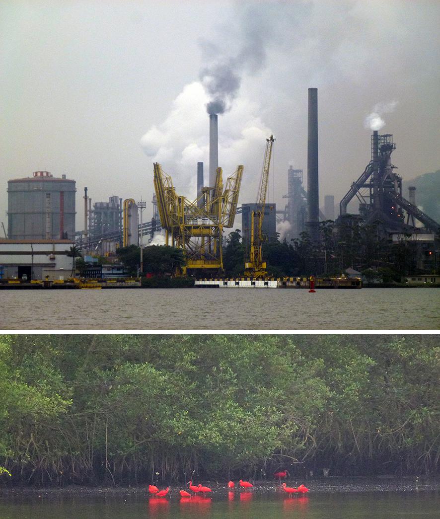 Entre la serra do Mar et Santos se situent les zones industrielles de Cubatão, qui comporte notamment des usines sidérurgiques, des raffineries, et des industries chimiques. Sans atteindre toujours – heureusement - les proportions d'un accident aussi dramatiques que l'incendie d'un oléoduc en 1984, qui détruisit complètement la favela de Vila Socó, cette présence cause évidemment des problèmes environnementaux. Ils sont d'autant plus graves que la baixada comporte des zones de mangroves et de forêt littorale où vivent encore de nombreuses espèces d'animaux sauvages (Fig. 29).