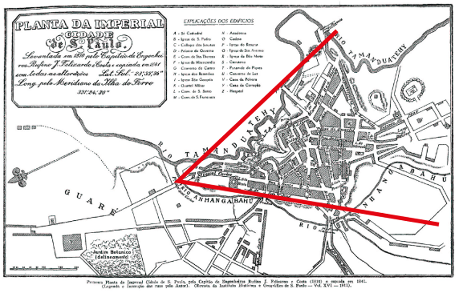 On peut mesurer l'ampleur et la rapidité de cette expansion urbaine en comparant plusieurs cartes anciennes. Sur la première, publiée en 1810, où le nord est orienté à gauche, la ville – qui comptait alors moins de 10 000 habitants – est encore enserrée dans le « V » historique (fig. 5). Celui-ci est formé par deux rivières coulant en contrebas, longeant deux des côtés de l'étroit plateau triangulaire sur lequel les Jésuites avaient construit le collège à l'origine de la ville : le Tamanduateí et l'Anhangabaú, respectivement « rivière des vrais fourmiliers » et « rivière des maléfices du diable » en tupi, la langue parlée par les Indiens locaux.