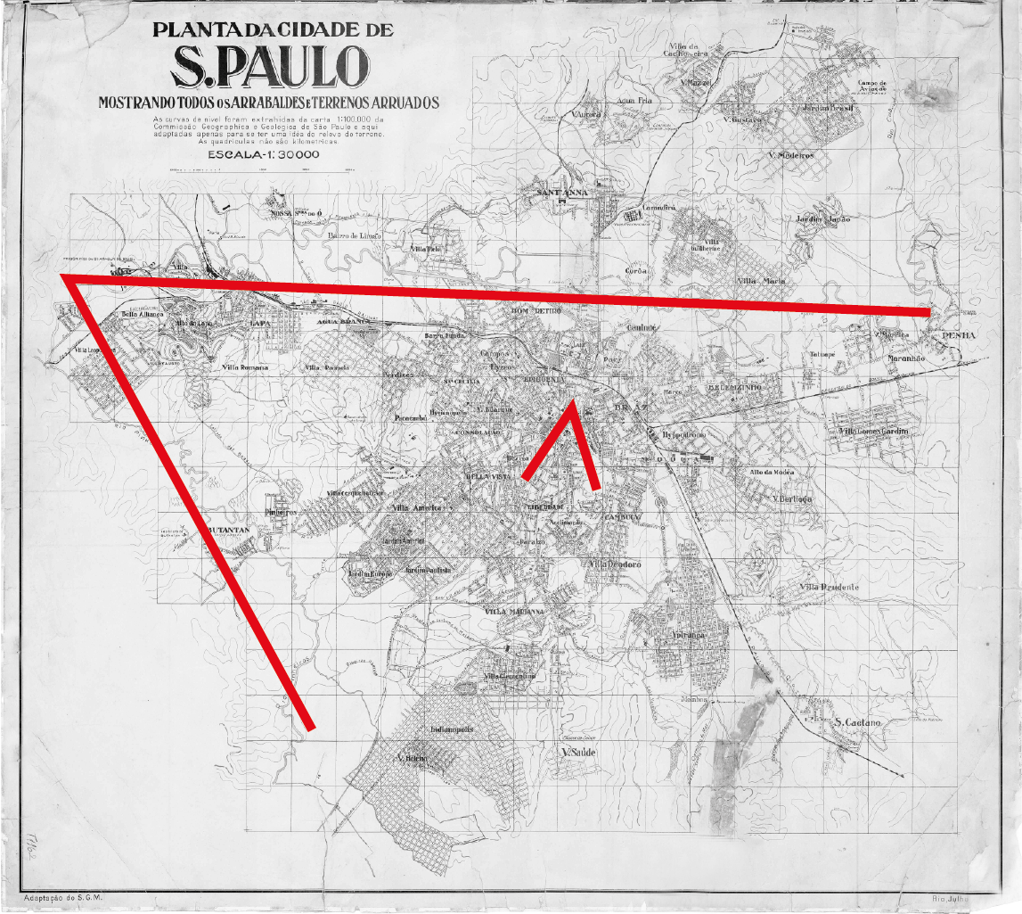 Sur la deuxième carte, datant de 1924, la ville compte près de 600 000 habitants, et un nouveau « V », formé par le Tietê et son affluent le Pinheiros, fait déjà paraître bien petit celui de la carte précédente (fig. 6). Ce deuxième « V » a lui-même été largement dépassé par la croissance urbaine ultérieure.