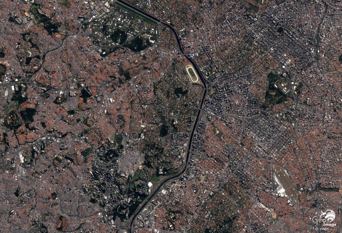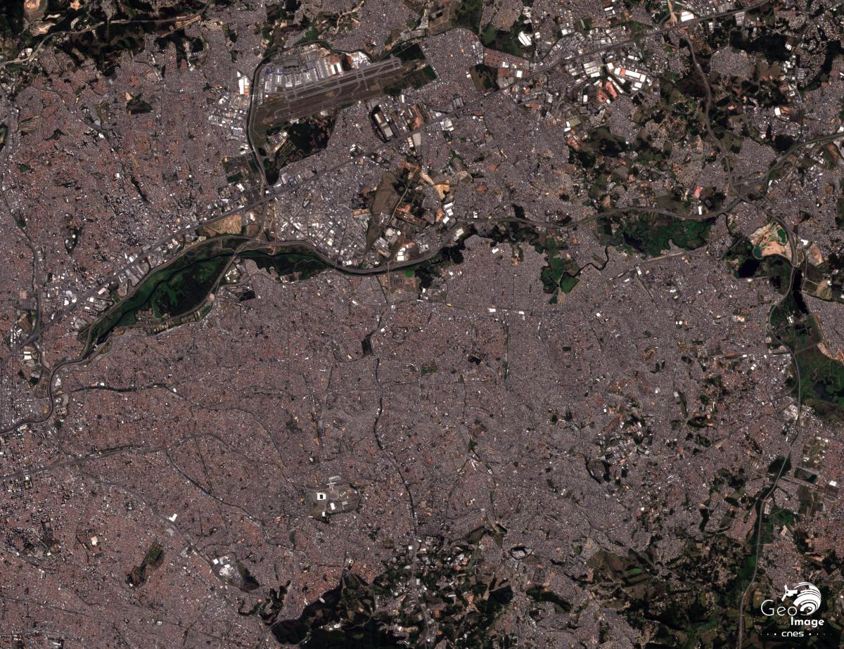 Cette image de São Paulo, grande métropole du Brésil, a été prise par le satellite Sentinel-2A le 30 août 2019. Il s’agit d’une image en couleurs naturelles de résolution native à 10m.