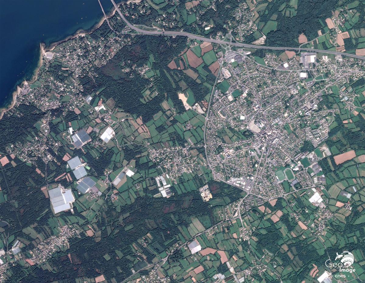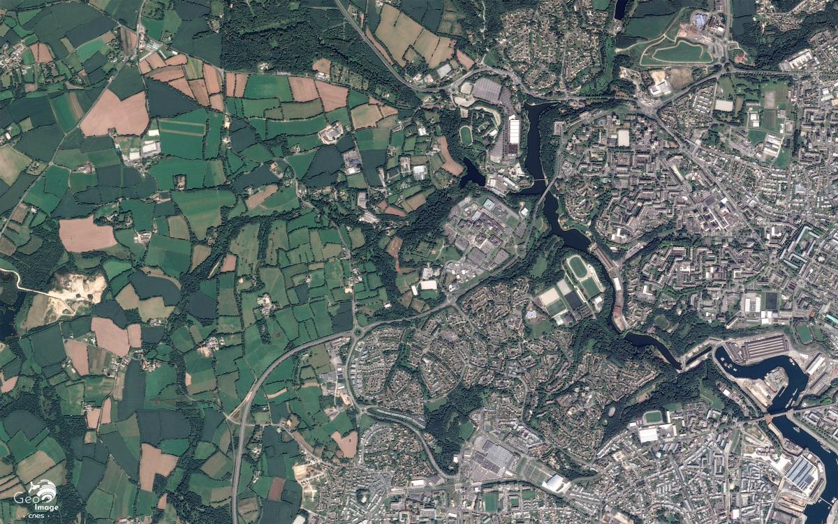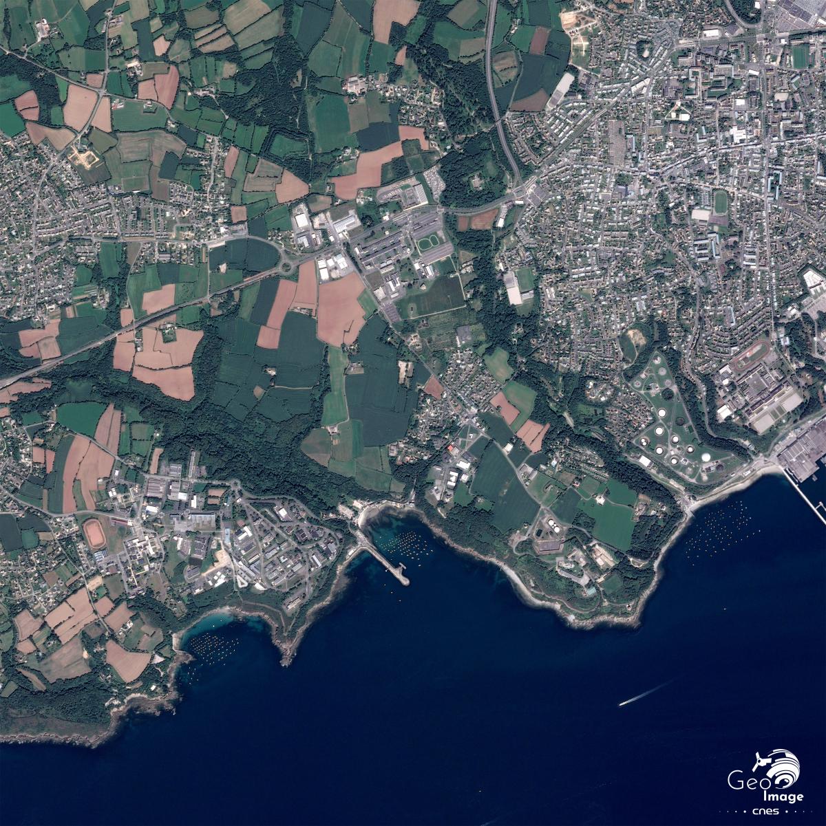 Cette image de Brest, ville portuaire bretonne, a été prise par un satellite Pléiades, le 27 aout 2017. Il s’agit d’une image de résolution native à 0,70m, ré-échantillonnée à 0,5m.
