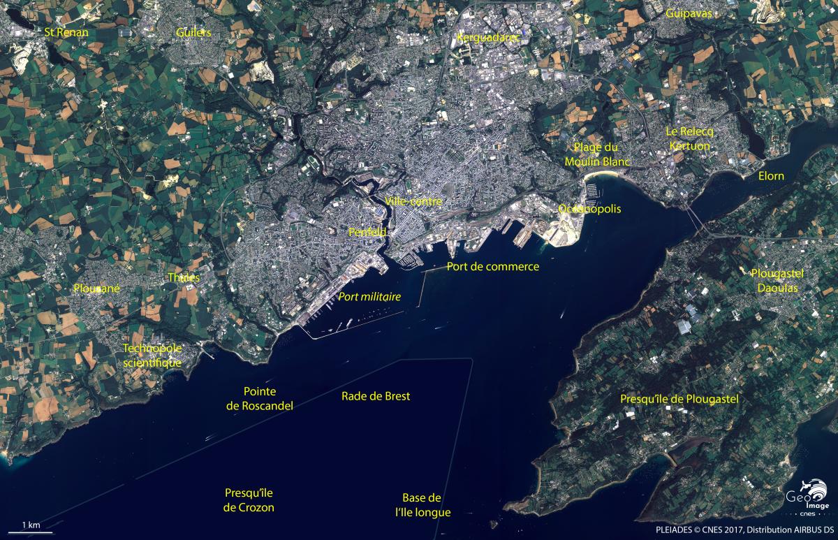 Cette image présente le versant nord de la rade de Brest, située à la pointe du Finistère, et à l’est la vaste presqu’île de Plougastel-Daoulas s’éparée par la vallée de l’Elorn. A l’échelle régionale, la pointe du Finistère est elle même formée de trois pointes isolant deux vastes ensembles maritimes pénétrant largement dans les terres : la rade de Brest au nord, la baie des Trépassés au sud.
