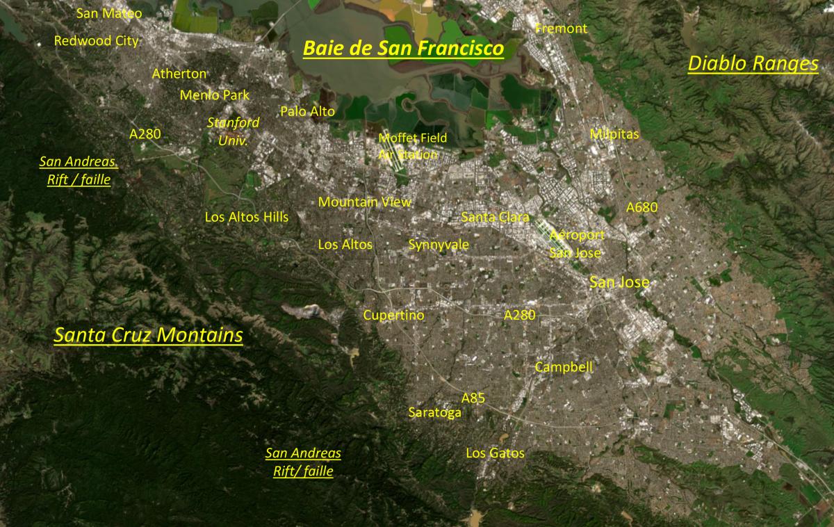 Au plan administratif, l’image couvre pour l’essentiel le comté de Santa Clara (121 km²) et sa « capitale » San Jose et celui de San Mateo (69 km²), dont on ne voit cependant qu’une partie, au nord-ouest. Cette ancienne zone agricole (vergers de prunes, pêches, abricots…) fut progressivement urbanisée à partir des années 1950/1960. Partie du nord ou du pôle historique de Santa Clara, situé comme nous l’avons vu au sud de l’aéroport de San Jose avec son mini-CBD, l’urbanisation gagne dans les décennies 1950/2010 presque tout le bassin.