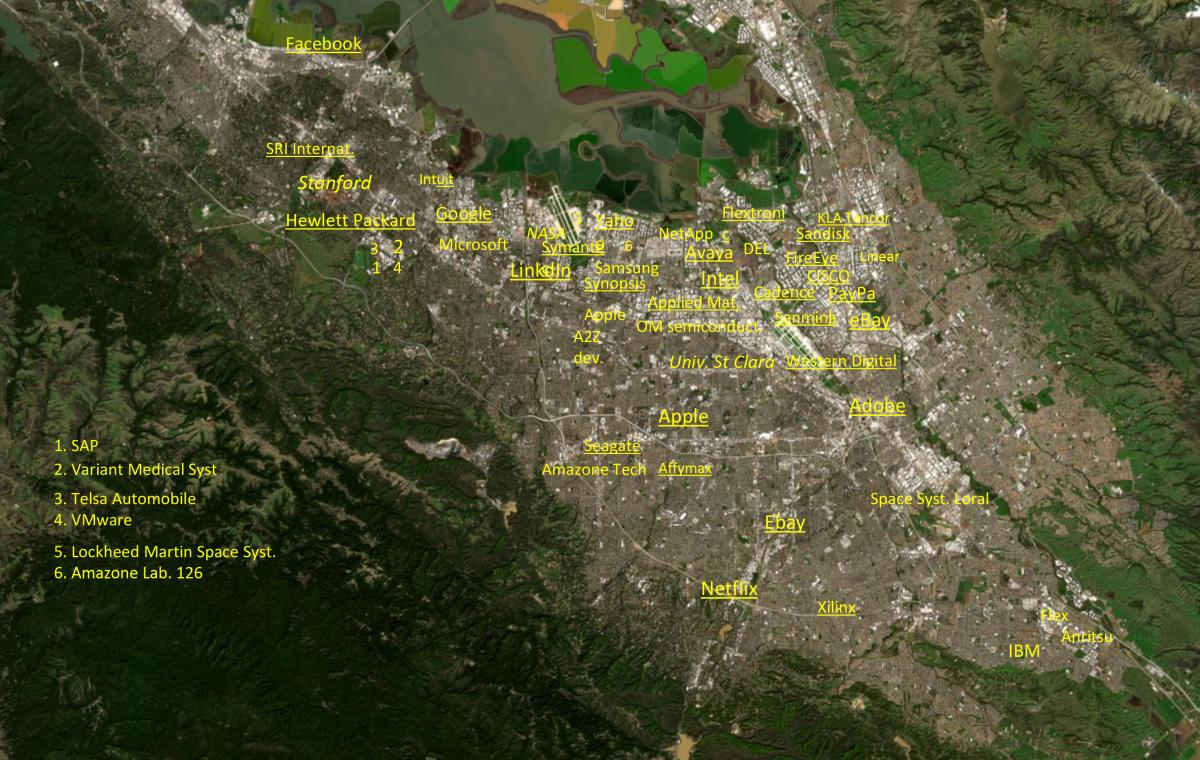 De nombreux créateurs ou développeurs de firmes aujourd’hui emblématiques (Hewlett-Packard, Cisco Systems, Sun Microsystems, Atari, Google, Symantec, Intuit, PayPal, Yahoo…) sont issus de ses laboratoires. L’école a produit au total 83 Prix Nobels, 27 lauréats de la Turing Award considéré comme le « Prix Nobel » des hautes technologies et 8 Médailles Fields considérée comme le « Prix Nobel » de mathématique. Située au nord-est de l’image, la Stanford emploie 15 000 salariés et accueille 16 500 étudiants venant du monde entier.