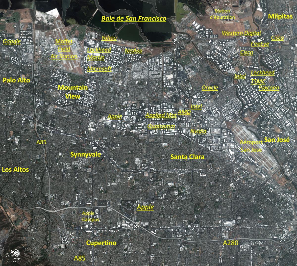 Au fond de la Baie de San Francisco sur les comtés de Santa Clara et de San Mateo s’étend la Silicon Valley. Sur un espace réduit de 200 km², soit deux fois la surface de la ville de Paris, ce territoire productif fondé sur la science et le développement des hautes technologies est un des pôles étasuniens et mondiaux de l’innovation. Sur la strate des « vieilles firmes traditionnelles » (Hewlett-Packard, Intel, Apple…) sont venues se superposer les nouvelles firmes de l’internet comme Google, Facebook, Yahoo, LinkedIn, Twitter, PayPal, eBay ou Netflix. Mais son dynamisme débouche sur un espace saturé qui est à la fois un des plus riches et un des plus chers au monde.