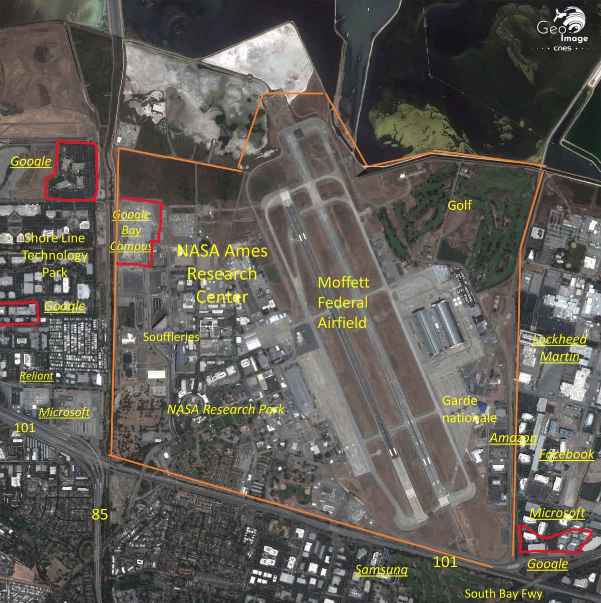 Largement connecté à la Silicon Valley, l’ARC a ouvert en 2002 le NASA Research Park qui regroupe sur un même campus les départements de plusieurs universités (Carnegie Mellon, Universités de Californie ou de Santa Clara, Singulary University). Au nord-ouest du terrain, on repère sur l’image deux vastes terrains en bordure de la clôture de sécurité. Ils correspondent aux 400 hectares que la NASA loue par un bail de 60 ans à Google depuis 2014. Sur cette image de 2018, les nouveaux bâtiments sont alors en pleine construction. Ceci reflète et confirme les liens étroits tissés entre la NASA et Google depuis le mémorandum conjoint de 2005.
