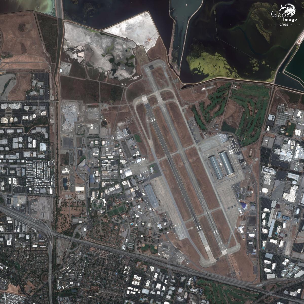 Cette vaste enclave urbaine est en fait spécialisée en deux espaces différents. A l’est se déploie le Moffett Federal Airfield, un aérodrome civil et militaire des administrations étasuniennes géré par l’ARC qui accueille des avions de la Garde nationale de Californie. On repère très bien ses deux pistes de 2.400 et 2.800 m de longueur. Construits à partir des années 1930, les grands hangars, bien visibles, sont pour partie classés au patrimoine historique.