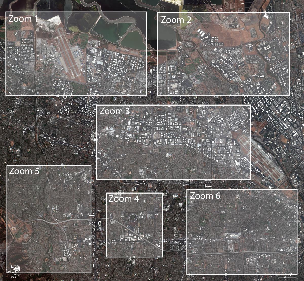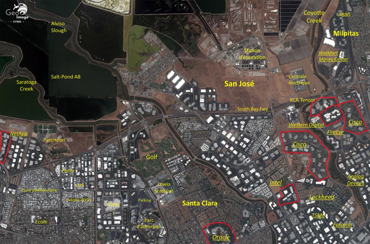Cette image couvre le centre-est de la Silicon Valley, avec dans le coin nord-est le cône de bruit des pistes d’envol de l’aéroport de Santa Clara dont les sols dénudés apparaissent bien sur l’image. On repère bien les vastes coupures urbaines causées par les sillons des autoroutes A880 et A280 qui rappellent l’omniprésence de l’automobile dans les mobilités urbaines. Au centre-nord de l’image, on distingue l’université de Santa Clara, fondée par les Jésuites en 1851 et qui est donc une des plus vieilles institutions de Californie. Elle rappelle les puissants héritages hispaniques de la Californie dès le XVIem siècle avant son rattachement aux États-Unis en 1848/1850, puisque - par exemple - San José correspond à la première colonie installée par des Franciscains en 1769. On trouve plus au sud le Santa Clara Mission Cemetery et le Mission City Memorial Park qui viennent en complément.