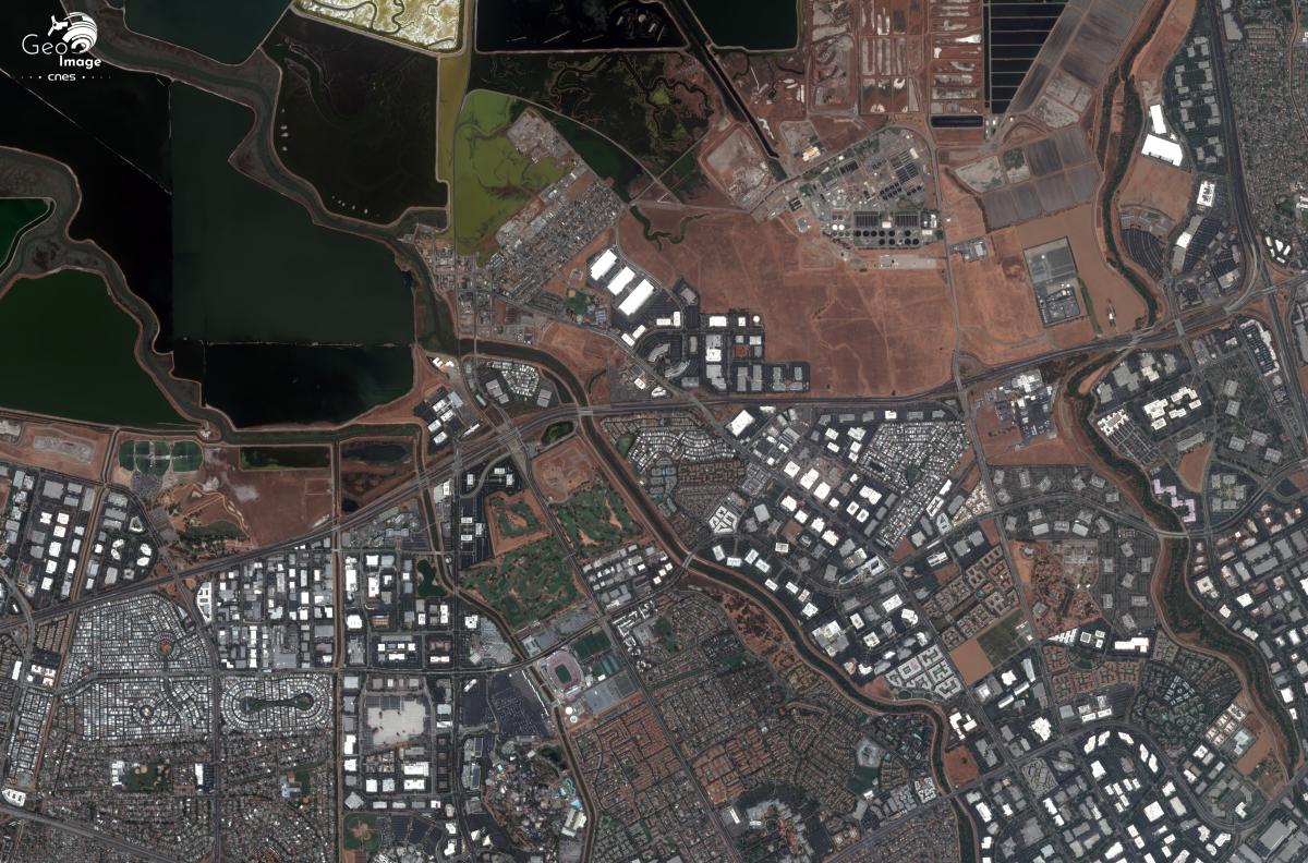Cette image a été prise par le satellite Sentinel-2 le 19 février 2019. Il s'agit de la Silicon Valley, le pôle des industries de pointe et des universités prestigieuses situé dans la partie sud de la baie de San Francisco en Californie. Il s’agit d’une image en couleurs naturelles de résolution native à 10m.