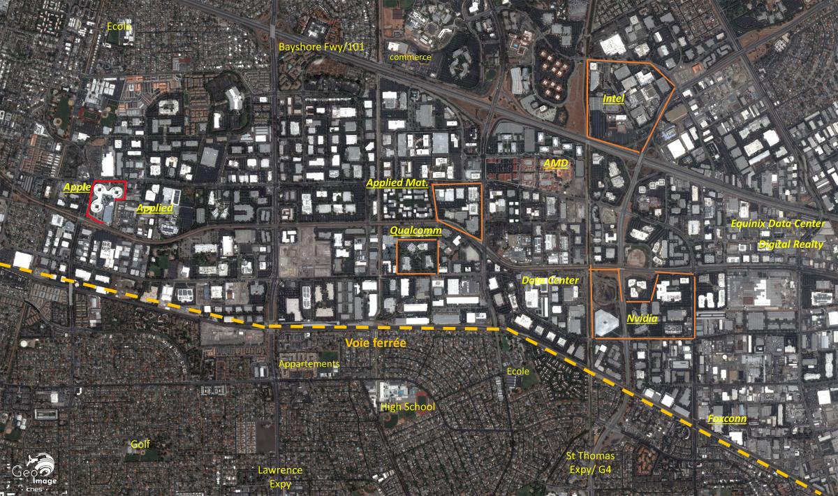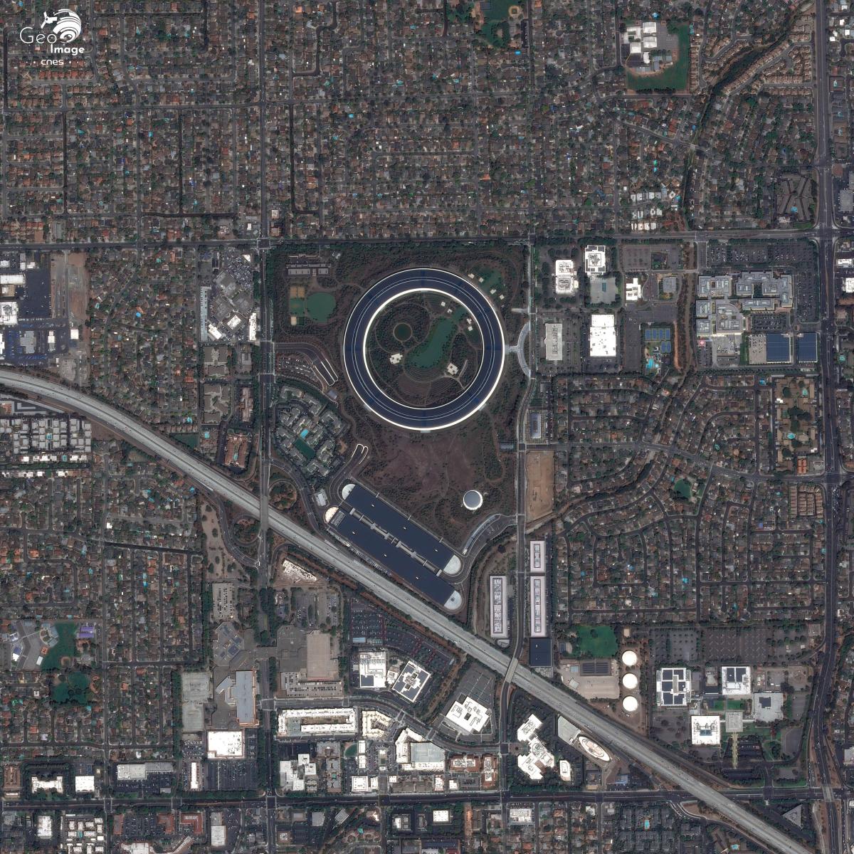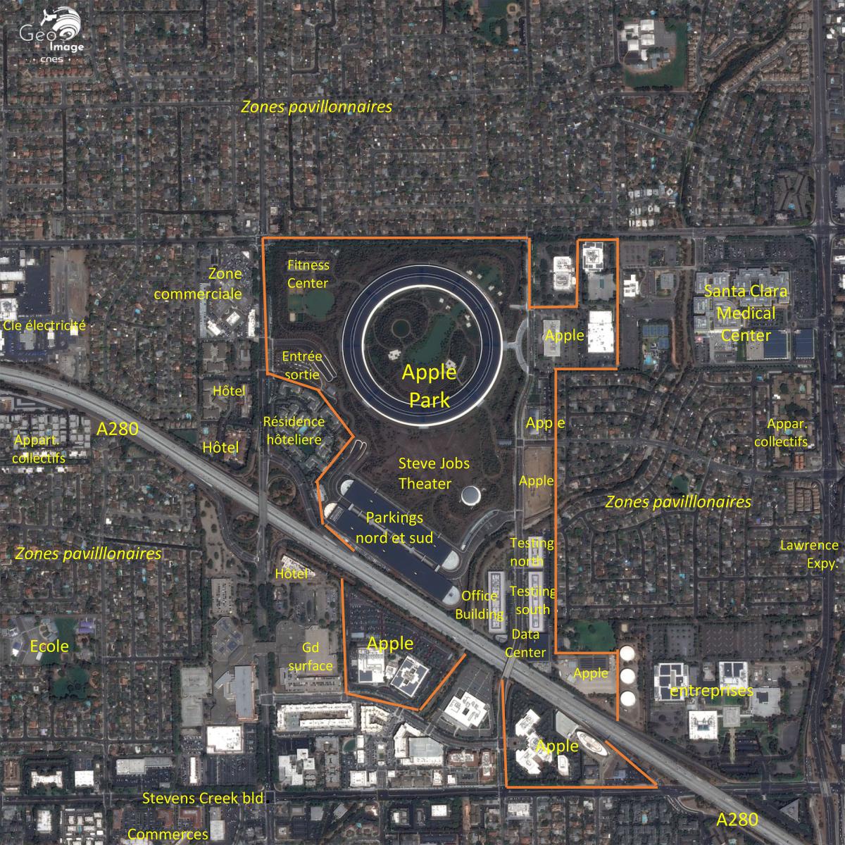 L’intérêt de l’image est surtout de couvrir l’immense site de 71 hectares d’Apple, qui se situe administrativement à l’extrême limite de la commune de Cupertino dans son angle nord-est. Au total, en employant 25 000 salariés, Apple - qui est présent sur la commune depuis 1977 - est de très loin 1er employeur et 1er contribuable de celle-ci et un des géants avec Google de la Silicon Valley.