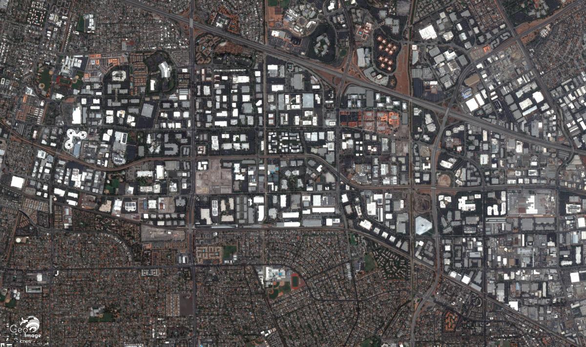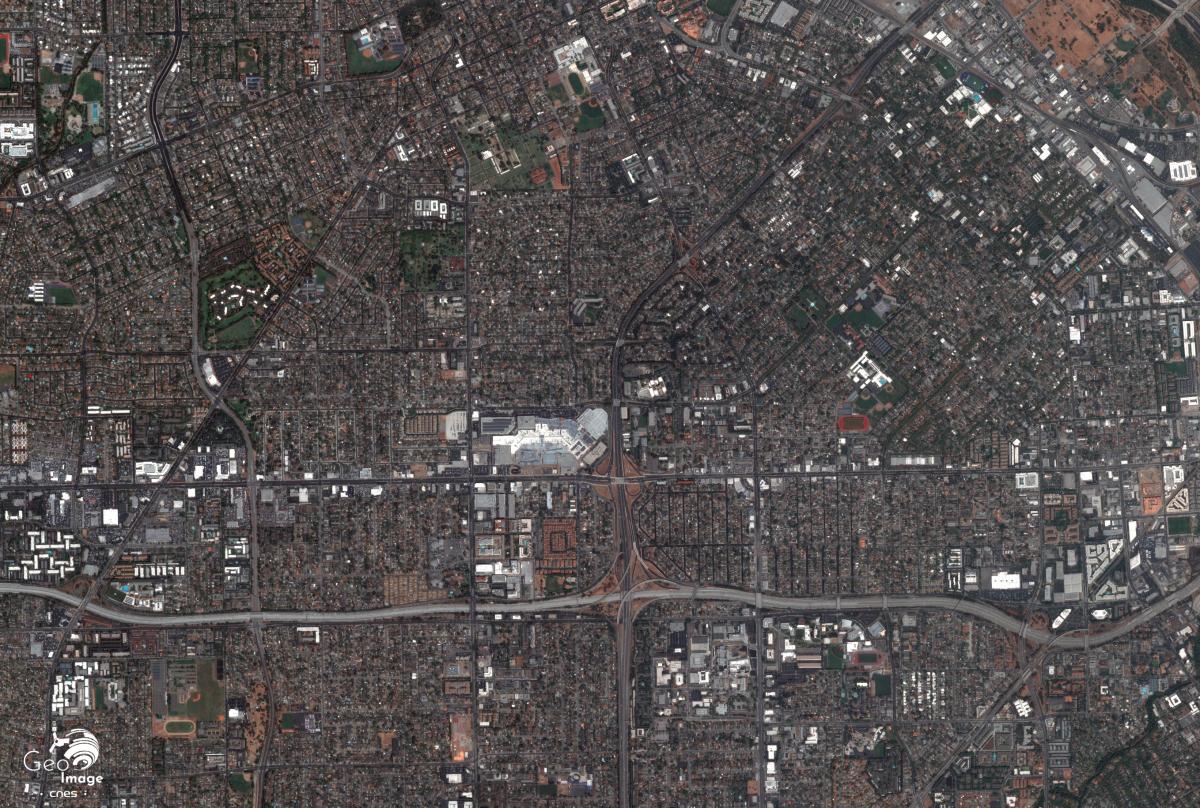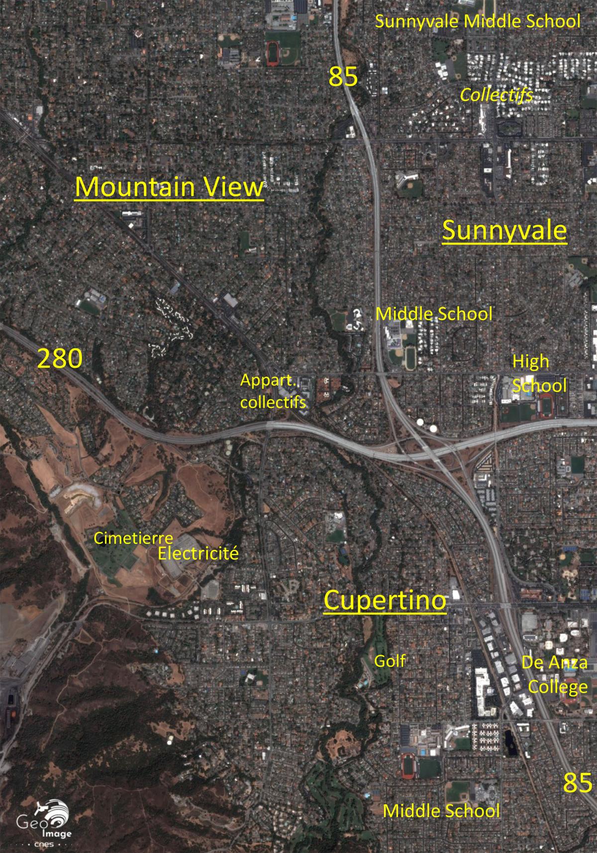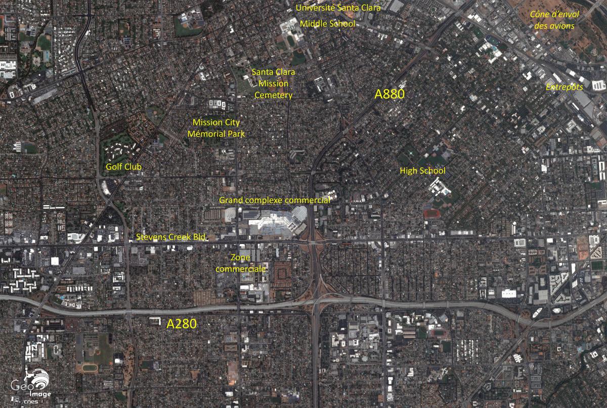 L’image porte sur l’espace centre-sud de la Silicon Valley dans la commune de Cupertino. Dominé par la fonction résidentielle et le modèle pavillonnaire traditionnel des immenses banlieues étasuniennes, cet espace est organisé par deux axes ouest/est - le vieux Stevens Creek Bld au sud de l’image et l’autoroute A280 - et un axe nord/sud, la Lawrence Expy. à l’est de l’image. Ces axes cristallisent - comme souvent - les grandes fonctions commerciales et hospitalières (cf. Santa Clara Medical Center).