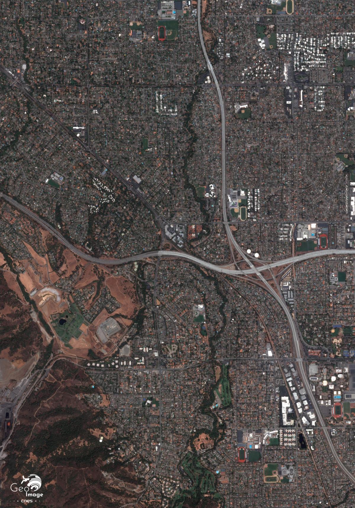 Cette image couvre la partie occidentale de la Silicon Valley et couvre les pentes de la retombée orientale des Santa Cruz Mountains. La région est traversée par les autoroutes A85 et A280 bien visibles sur l’image. Comme souvent, le tissu urbain pavillonnaire est polarisé et organisé par les axes routiers, les centres commerciaux et les établissements scolaires. Mais ces pentes sont tournées vers l’est et le soleil levant, le cadre de vie y est plus soigné, les densités moindres, la verdure plus présente, les parcelles des propriétés plus larges, les piscines plus nombreuses.