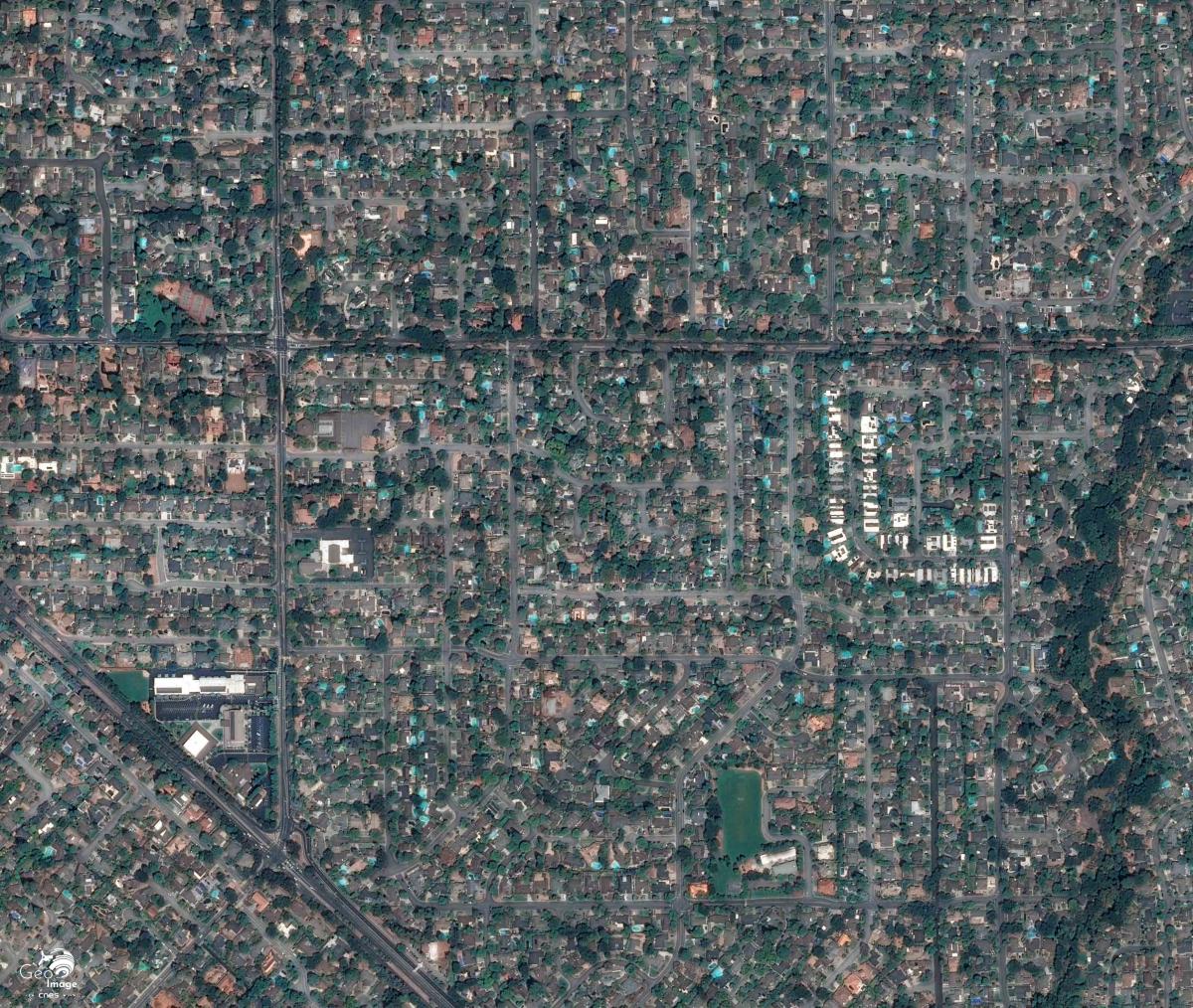 Nous sommes ici presque au centre de l’image à cheval sur les communes de Santa Clara et Sunnyvale, dont les territoires sont organisés nord/sud. L’image zoom met bien en lumière la véritable césure spatiale et fonctionnelle que représente la voie ferrée, qui traverse le centre de la Silicon Valley selon un trait général sud-ouest/nord-est.