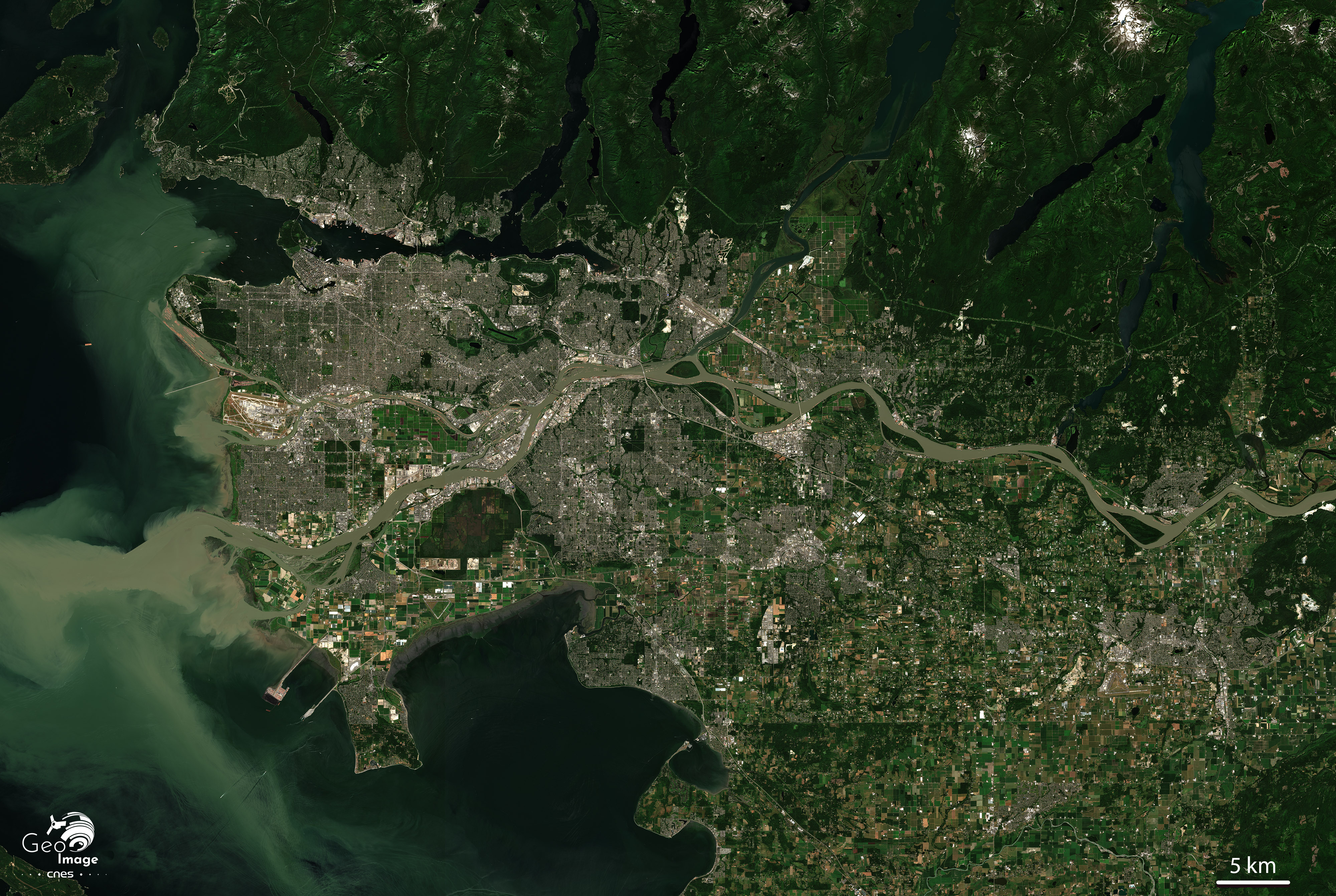Cette image couvre l’extrémité occidentale de la frontière terrestre avec le double poste frontière de Peace Arch et Pacific Highway, l’un des plus importants et des plus fréquentés le long de la frontière Canada/Etats-Unis ainsi que le début de la frontière maritime dans le Pacifique à travers les baies de Semiahmoo et de Boundary.