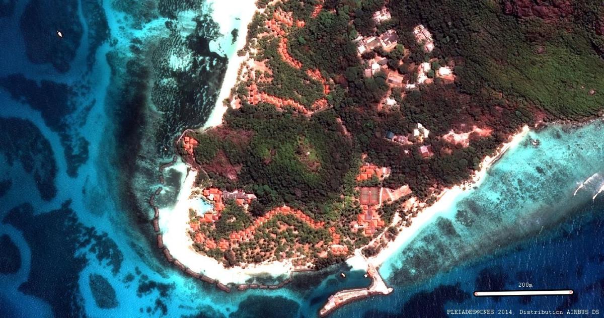 Une précision : l'île de Sainte-Anne présente sur cette image, même si elle valorise touristiquement sa surinsularité vis-à-vis de Mahé de la même manière, n'est pas une ile-hôtel. L'image Pléiades étudiée dans ces fiches ne couvre pas la zone des îles-hôtels.