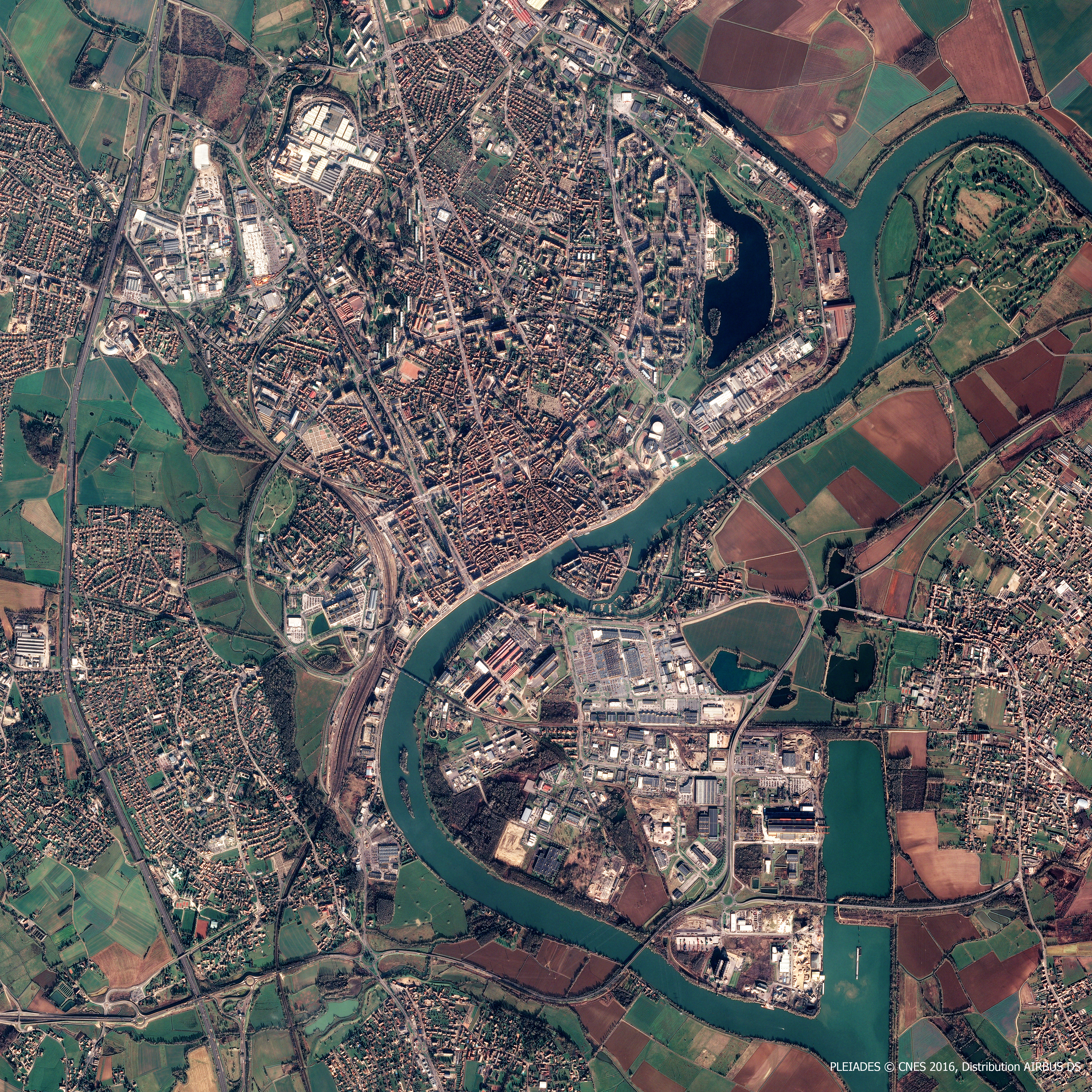 Cette image a été prise par un satellite Pléiades le 25/01/2016. Il s’agit d’une image en couleurs naturelles, de résolution native à 0,70m, ré-échantillonnée à 0,5m.