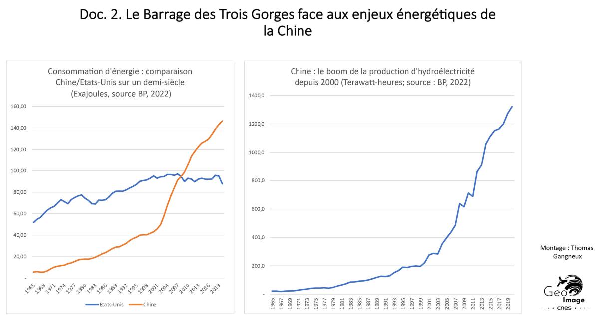 Toutes les étapes de la construction sont alors médiatisées. Cette prouesse technologique permet de rappeler le rôle de leader du pouvoir central dans l’aménagement du territoire et sert d’outil d’affirmation de puissance sur les populations locales et sur la scène internationale. Un premier remplissage, à la côte 153 mètres, a lieu en 2003 et inaugure le début de la production hydroélectrique. En 2009, le remplissage total, à la côte 175 mètres, marque la mise en service des 26 groupes turboalternateurs alimentant la production électrique. Ce barrage s’inscrit dans une stratégie énergétique nationale qui vise à répondre à l’explosion des énormes besoins d’un pays en pleine croissance (doc 2.).