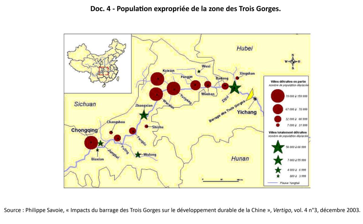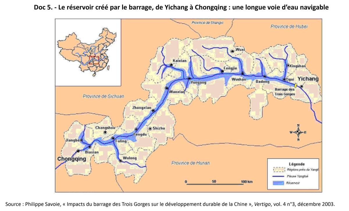 Ces déplacements forcés (doc. 4) ont participé à la forte croissance démographique des villes du fleuve. Ainsi, la population de la ville de Yichang a été multipliée par trois, passant de 564.000 habitants en 1994, date du lancement de la construction du barrage, à 1,6 million en 2022. Pour autant, la population du district de Yichang est restée stable avec environ 4 millions d’habitants. Il y a donc eu une recomposition de la répartition de la population, via en particulier une concentration urbaine accentuée. Ainsi, à l’image de Yichang, le Yangsi devient un magnifique axe navigable, « une rue de villes » (T. Sanjuan, 2004) et un axe logistique majeur avec la ligne ferroviaire à grande vitesse reliant Wuhan à Chengdu, via Yichang puis Chongqing.