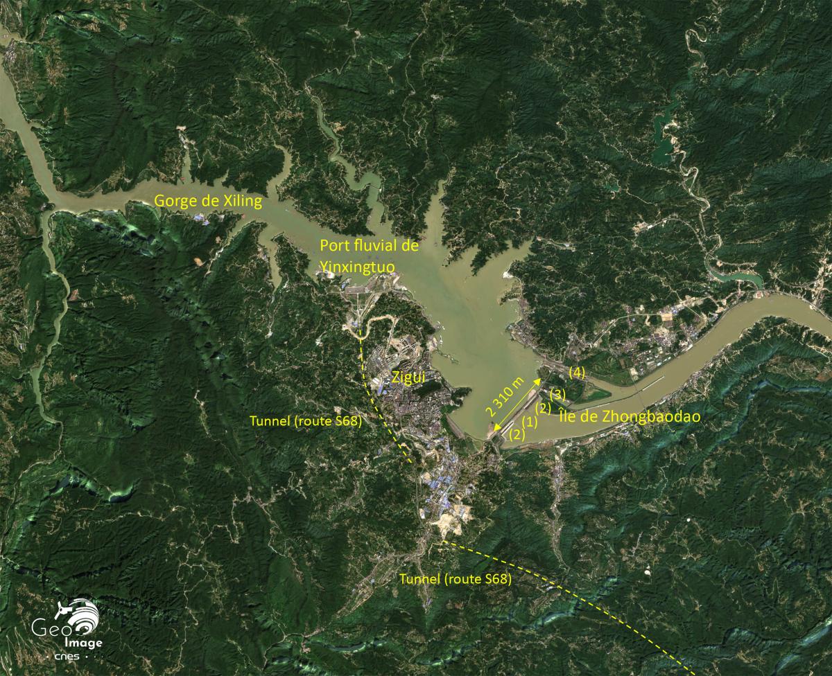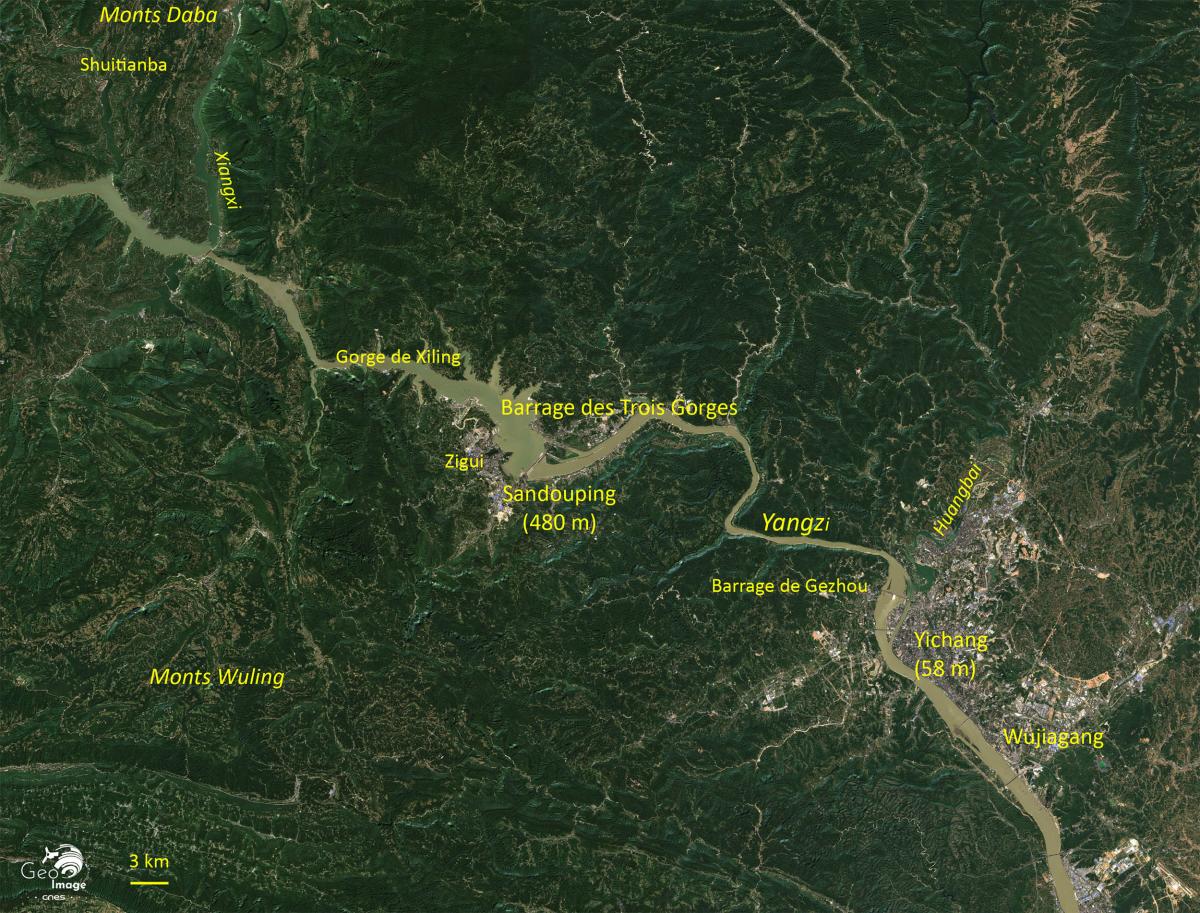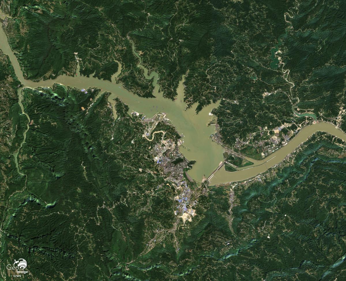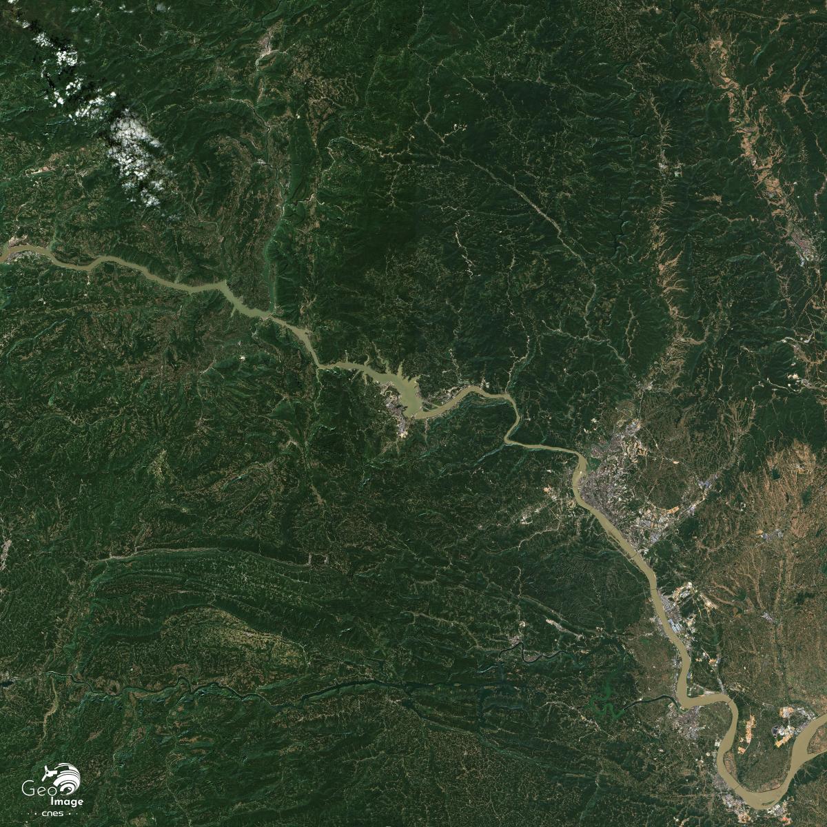 Cette image centrée, sur le barrage des Trois Gorges, englobe une superficie de plus de 4 400 km². Le barrage est situé à Sandouping, près de la ville de Yichang, province du Hubei, en aval du site touristique des Trois Gorges, au centre de la Chine. Maîtriser ce fleuve, c’est agir sur le 3ème plus long fleuve du monde (5980 km), dont le bassin versant de 1,8 million de km² occupe à lui seul 20 % du territoire chinois, concentre 400 millions d’habitants et réalise 40 % de la production industrielle et agricole du pays.