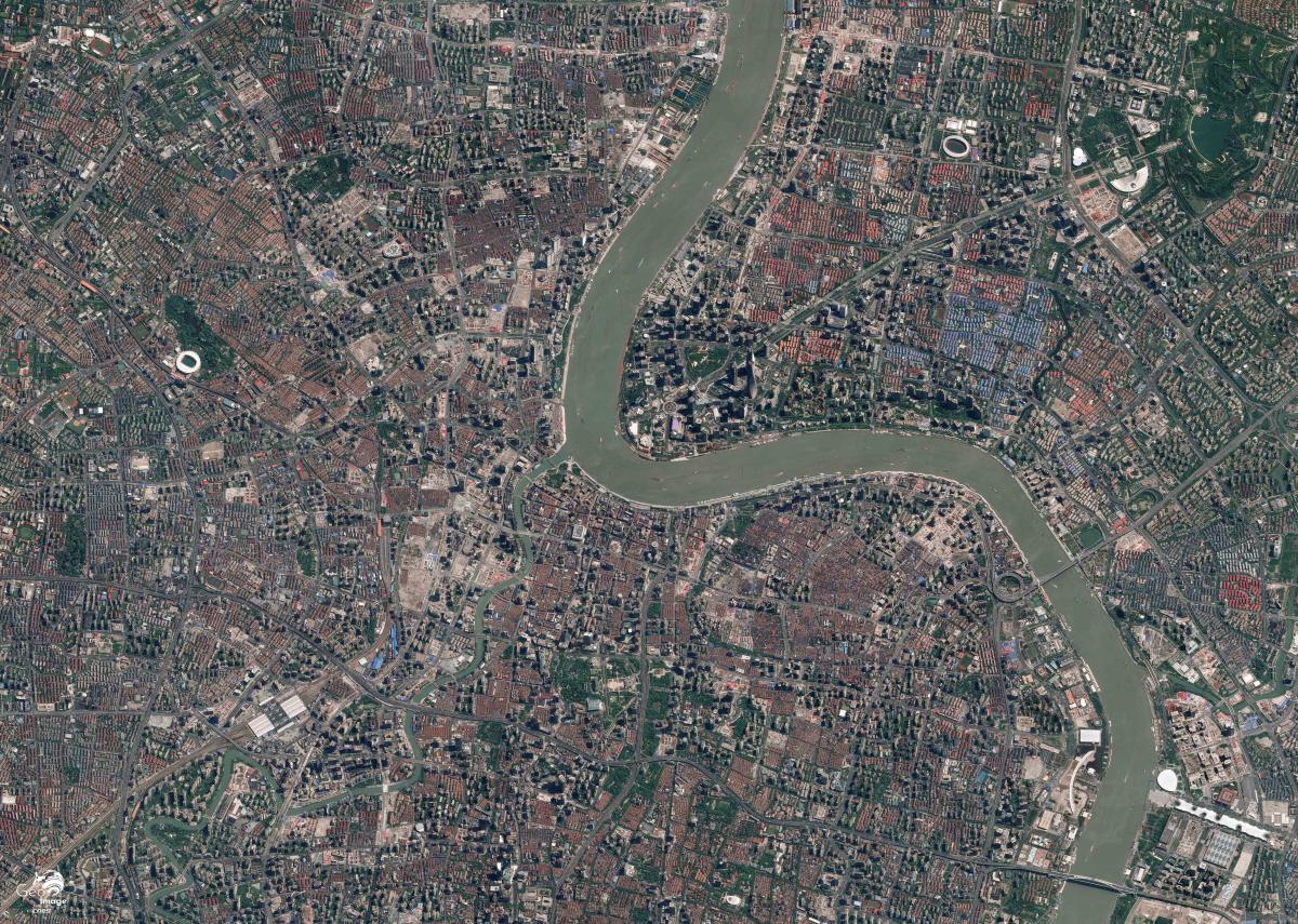 Nous sommes ici sur le fleuve Huangpu avec l’extrémité de la nouvelle zone de Pudong en rive droite et le quartier de Jing’an en rive gauche, lui-même traversé par le périphérique intérieur. Le pont Lupu, en forme d’arc, est bien visible en bas de l’image, et le pont Nanpu en haut. Nous sommes ici sur l’espace occupé par l’Exposition universelle de 2010, qui servit de vitrine internationale à la ville et au pays. De cette opération de prestige demeurent encore quelques bâtiments emblématiques.