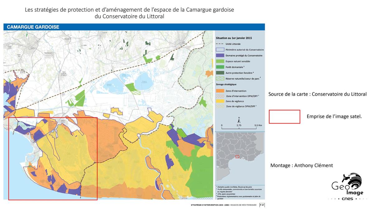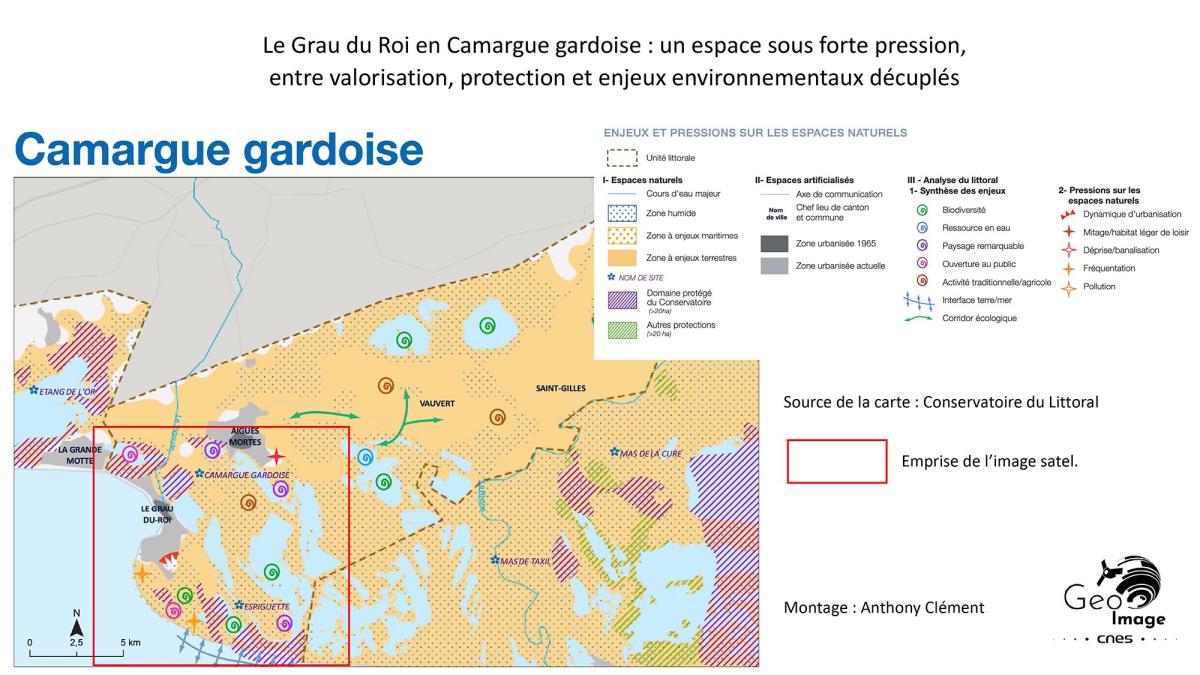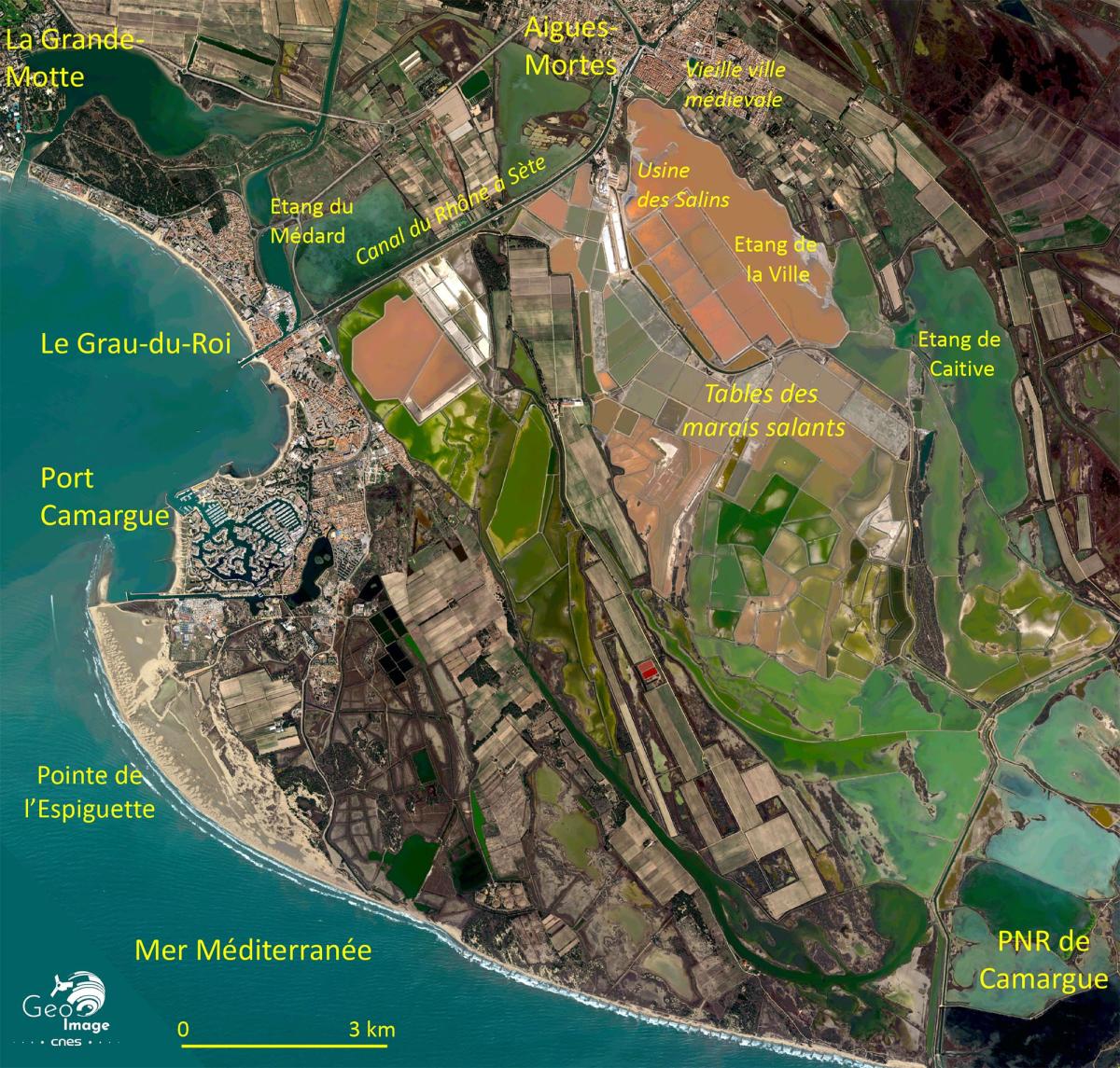 L’interface entre terre et mer se matérialise ici sur l’image par un paysage singulier. Vu de satellite, l’espace étudié laisse apparaître des formes et des couleurs très diverses, héritées de dynamiques naturelles et d’actions anthropiques. A l’exploitation ancienne du sel s’est ajoutée une mise en tourisme qui a intensément transformé le littoral et l’arrière-pays. Les pressions exercées sur ce milieu rendent d’autant plus vive sa protection, afin de concilier usages économiques et préservation d’écosystèmes à l’équilibre fragile.