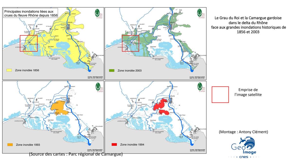 En bordure Nord de l’image, dans l’arrière-pays, se trouve la commune d’Aigues-Mortes (8.500 habitants), une ancienne cité fortifiée qui s’est fortement développée depuis les années 1980. Le site originel apparaît de manière franche dans le quadrilatère au bâti très dense entouré de remparts, érigés sous le règne de Saint-Louis, toujours intacts. Cet ancien site portuaire médiéval est aujourd’hui largement à l’intérieur des terres, témoignant ainsi de la puissance des processus d’érosion/ transport/ accumulation qui se déploient en milieu méditerranéen en lien avec son cadre montagnard.