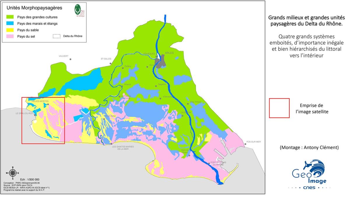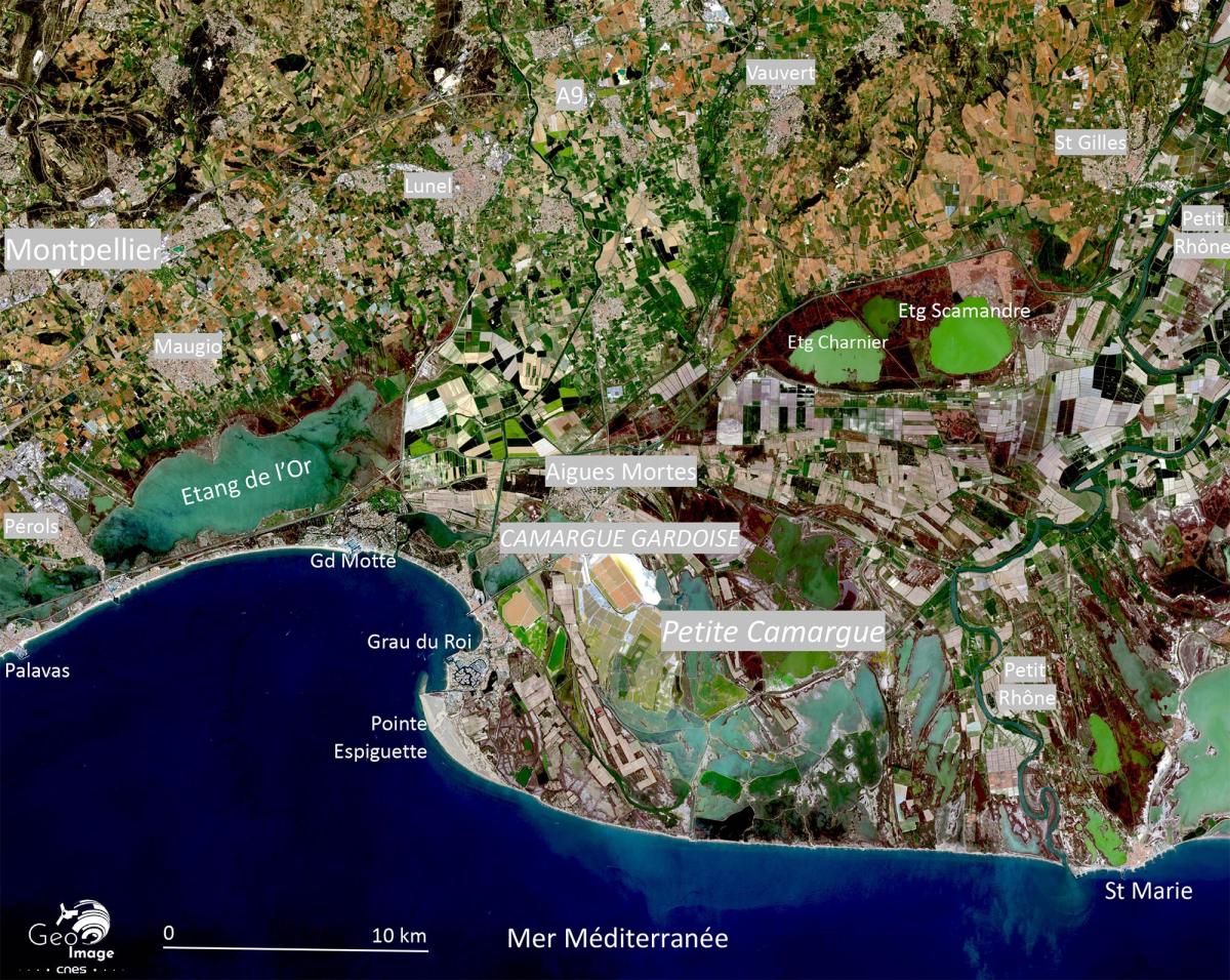 Un immense delta construit par le Rhône. Cette image couvre l’Ouest de l’immense delta du Rhône. Nous sommes bien ici en bassin méditerranéen où le rapport entre les grands fleuves et la mer repose sur de grands deltas fluviaux construits par de puissantes dynamiques d’accumulations sédimentaires pour des raisons climatiques et morphologiques spécifiques : Guadalquivir, Èbre, Rhône, Pô, Vardar, Nil...
