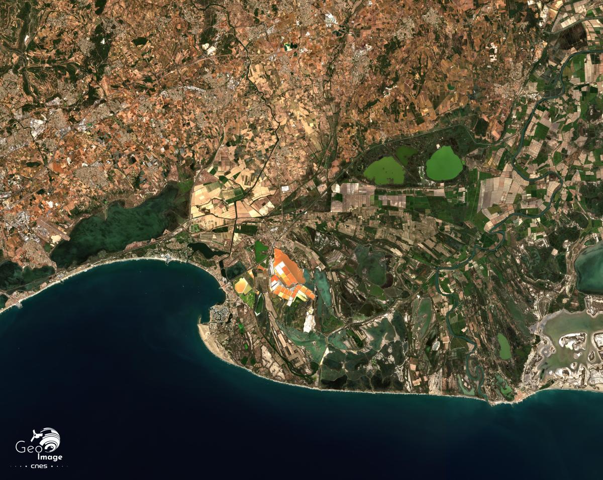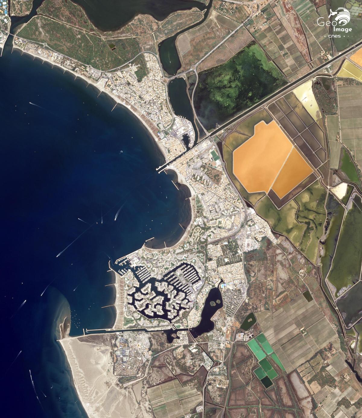 Cette image du Grau-du-Roi en Petite Camargue, a été prise par un satellite Pleiades le 23 mars 2022. Il s’agit d’une image en couleur naturelle, de résolution native à 0,70m, ré-échantillonnée à 0,5m.