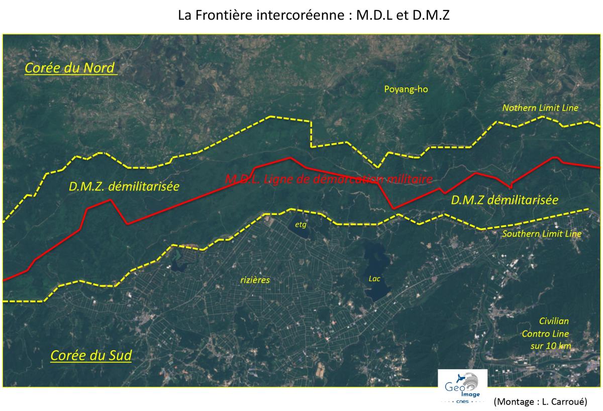 Longue de 248 km et suivant approximativement le 38ᵉ parallèle, la frontière entre la Corée du Nord et la Corée du Sud est l’une des plus fermées et militarisées au monde. Fruit de la guerre froide et de la guerre de Corée, elle demeure encore aujourd’hui un abcès de fixation des tensions régionales, continentales et mondiales. Ce système frontalier est organisé autour de quatre composantes spatiales emboîtées les unes dans les autres : au cœur, la ligne de démarcation militaire (Military Demarcation Line, MDL), qui sert de facto de limite frontalière entre les deux Corées ; la zone démilitarisée (Demilitarized Zone, DMZ), d’une dizaine de kilomètres de large ; les deux zones de front où sont installés les systèmes défensifs ; et enfin, la Civilian Control Line (CCL), qui se déploie sur une profondeur variant de 5 à 20 kilomètres vers l'arrière. Au total, il s'agit d'un système et de dispositifs en tout point exceptionnels, reflétant une situation géopolitique et géostratégique elle-même exceptionnelle.