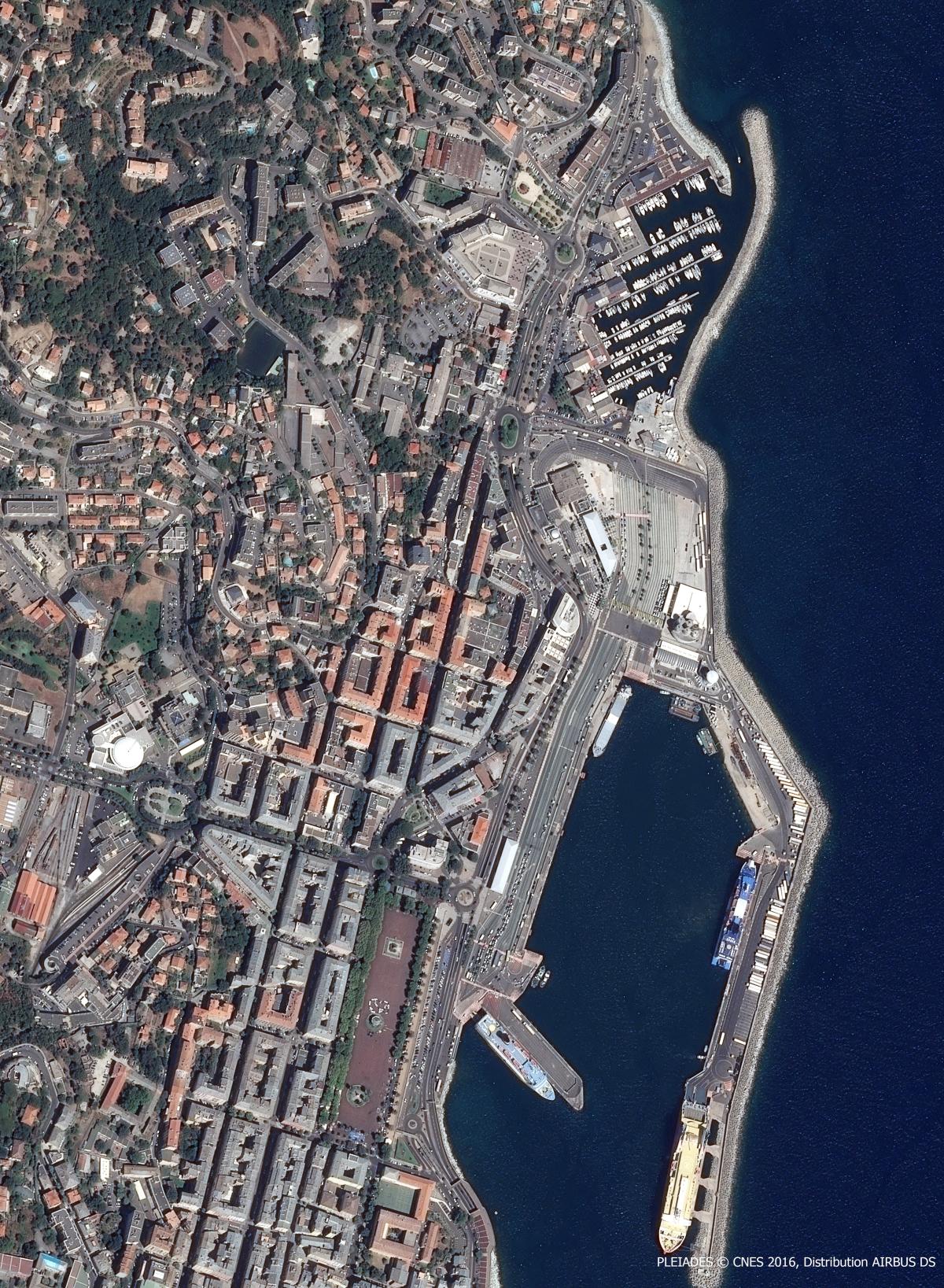 Cette image montre le cœur historique de la ville de Bastia. On y distingue au nord le Vieux-Port, site premier de l’implantation humaine sous la forme de cabanes de pêcheurs. Appelé initialement Porto Cardo, il a été renommé Terra Vecchia par les Génois, par opposition au nouveau quartier fortifié qu’ils ont construit en aplomb, Terra Nova.