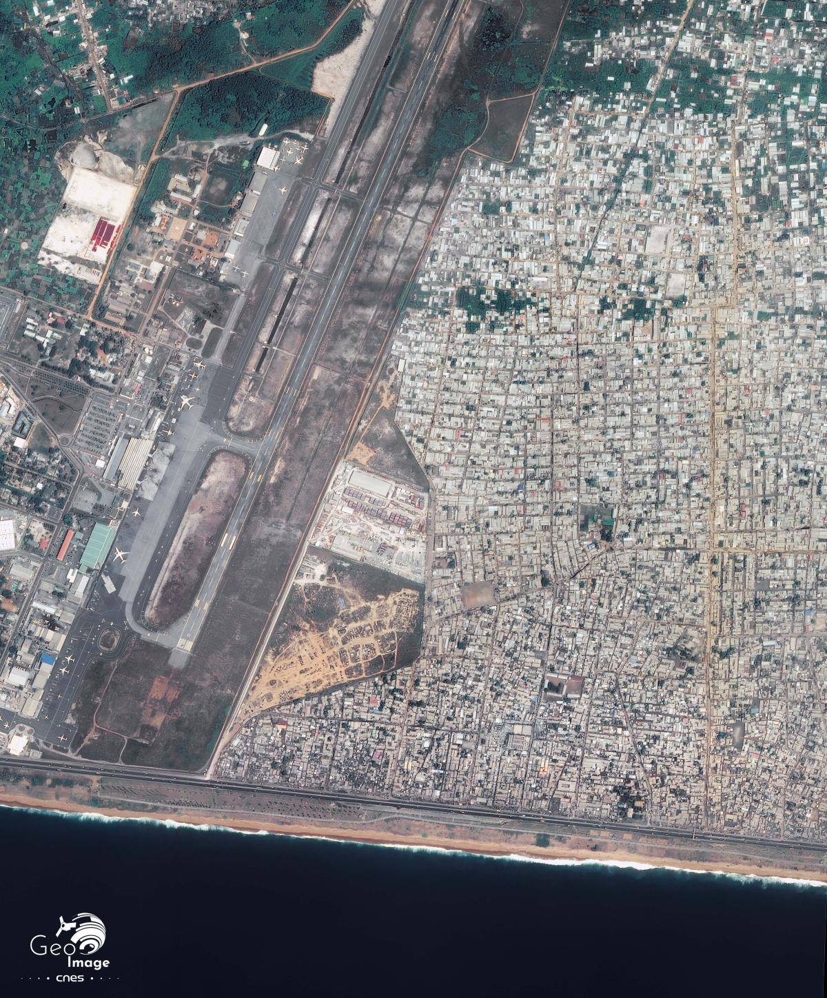 L’aéroport. Un second espace, au sud-ouest de l’image satellite, illustre l’héritage colonial, l’ouverture sur le monde et la fonction métropolitaine. Le quartier de Port Bouët, situé dans le prolongement de Vridy le long de l’océan, héberge l’aéroport international. Construit durant le « miracle ivoirien » dans les années 1970, à l’origine en périphérie de l’espace urbanisé, l’aéroport Félix Houphouët Boigny – FHB -, s’étend de l’océan à la lagune. Recevant plus de 2 millions de passagers en 2021, il a été profondément affecté par la crise ivoirienne.