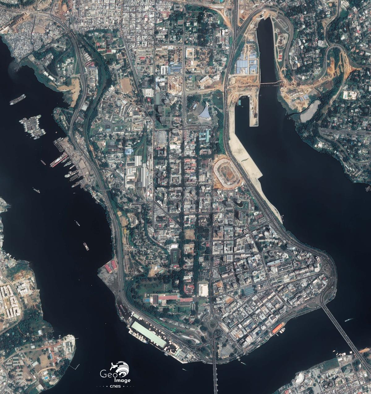 Cette image de la ville d'Abidjan, sur littoral Atlantique de la Côte d'Ivoire, a été prise par un satellite Pléiades le 25 janvier 2022. Il s’agit d’une image en couleur naturelle, de résolution native à 0,70m, ré-échantillonnée à 0,5m.