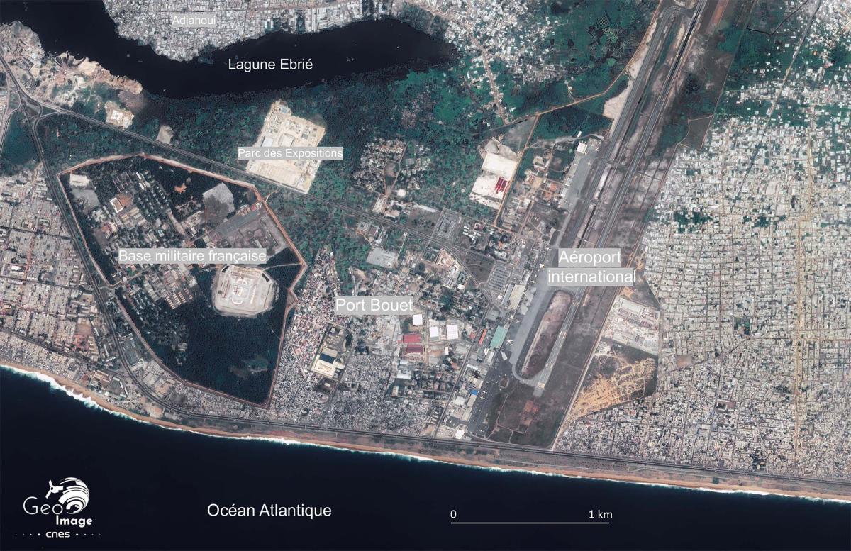 L’autre élément structurant, c’est la base militaire française. Présente depuis les accords de coopération des années 1960, elle devient le siège des FFCI (Forces Françaises de Côte d’Ivoire), l’une des deux bases opérationnelles avancées en Afrique de l’Ouest. Vaste espace ceinturé de murs épais, la base héberge un Etat-Major, une composante air dont le tarmac est visible, un hôpital, des logements pour les 950 militaires essentiellement du 43ème BIMA (Bataillon d’Infanterie de Marine). Elle dispose aussi d’une emprise dans la zone aéroportuaire.