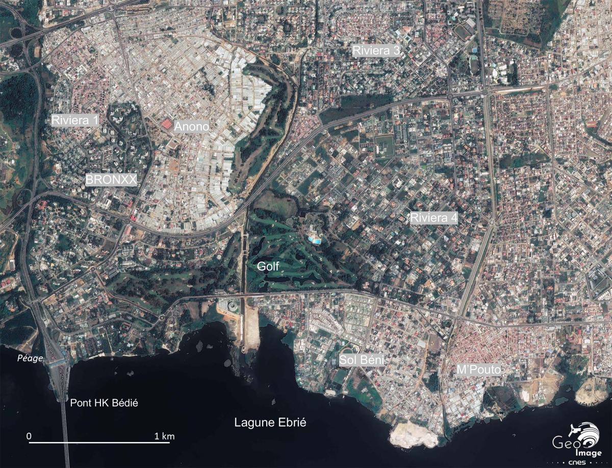 Plusieurs aménagements sont aisément identifiables sur le zoom : le golf au sud proche de la lagune, les quartiers Riviera 1 et 2 le long de l’artère C2 où coexistent des villas au sud, des centres commerciaux, des habitats pour les classes moyennes au nord et de l’habitat collectif dans le quartier du BRONXX. D’autres espaces reproduisent la même organisation comme Riviera 4 ou Cité verdoyante le long de l’autre axe nord - sud, la route E46.