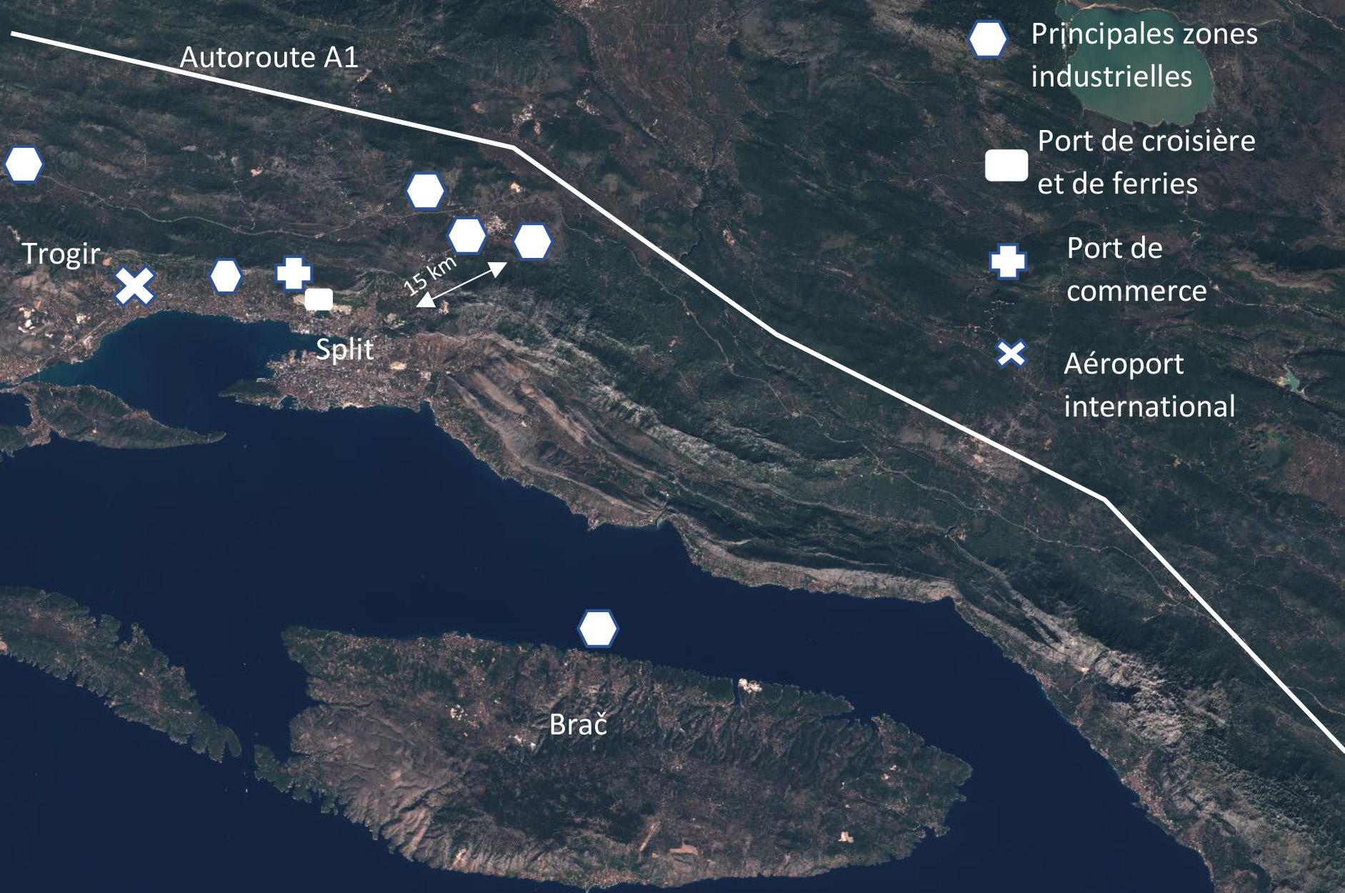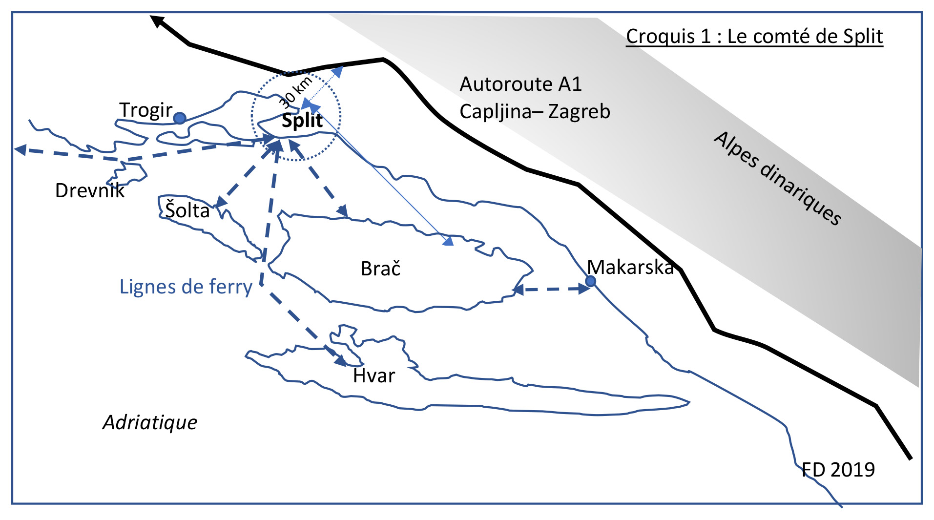 La ville de Split est en position de carrefour et d’interface, au centre de la Croatie, entre terre et mer. Elle appartient à la guirlande des villes littorales qui bordent l’Adriatique et la côte dalmate le long du littoral de la république croate (Rijeka, Zadar, Dubrovnik). Bordée par les contreforts de la chaine des Alpes dinariques qui s’étagent à une cinquantaine de km du trait de côte et dont l’altitude dépasse rapidement les 1 000 mètres, Split et sa région se sont développées autour des îles (Brac, Hvar, Korcula, Vis…) et des étroites plaines côtières de la côte dalmate. (croquis n°1 et n°2 en pdf).