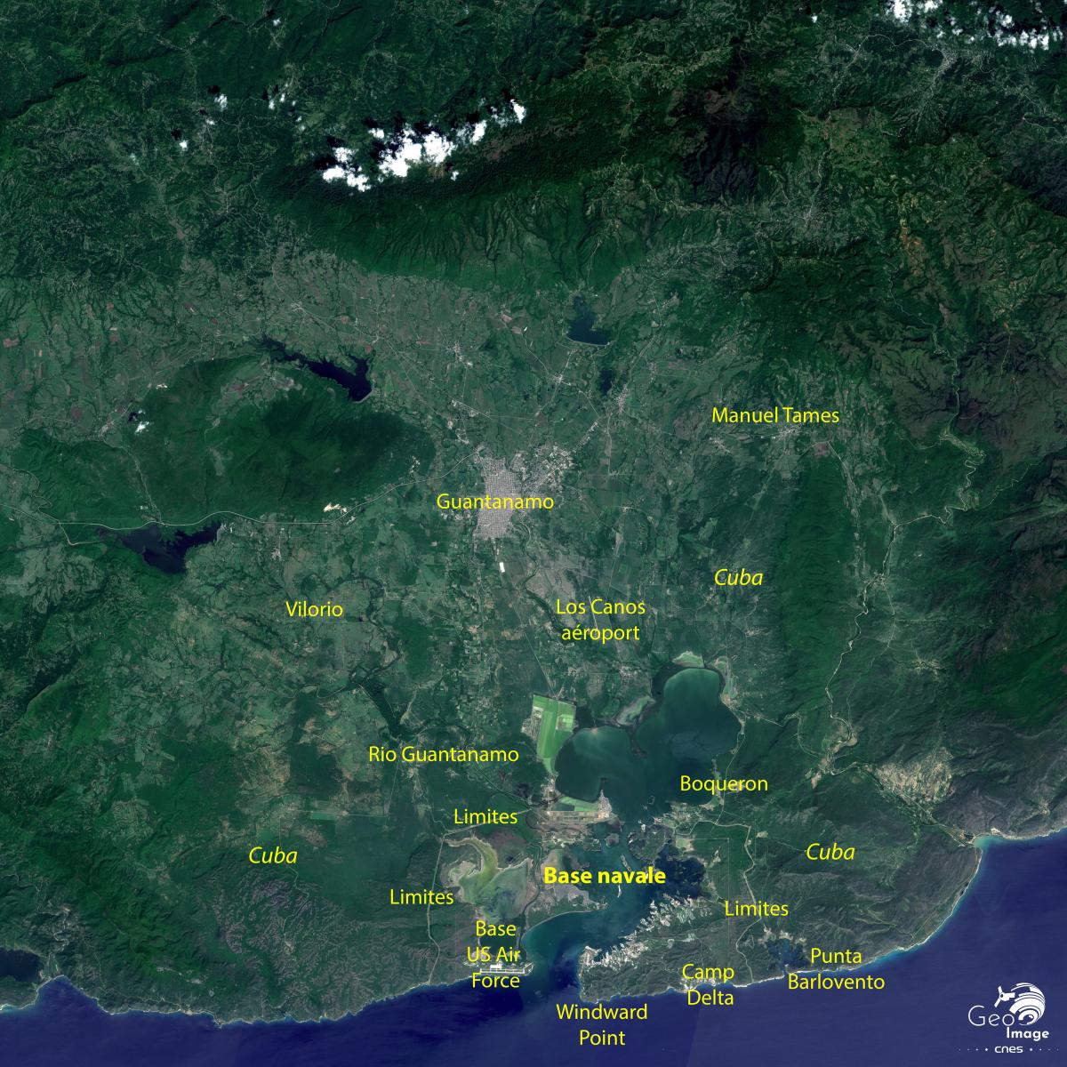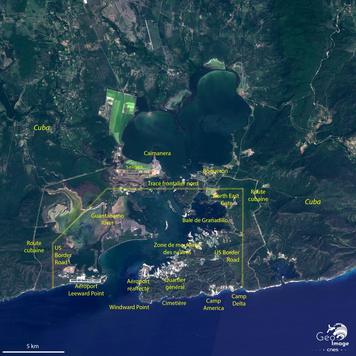 En la imagen « zoom » a grande escala, el dispositivo militar y fronterizo es aún más evidente. Del lado estadounidense, el trazado de los límites es muy geométrico porque fue definido durante la cesión de la base a Estados Unidos por Cuba en el marco del Tratado cubano-estadunidense de febrero de 1903. En aquella época, la relación de poder a favor de Estados Unidos era tan abrumadora que el Estado Mayor dibujó a grandes rasgos los límites sin preocuparse de los detalles topográficos del terreno que, táctica y técnicamente, pueden tener su importancia (delta anfibio, lagunas, islas, colinas y alturas…).