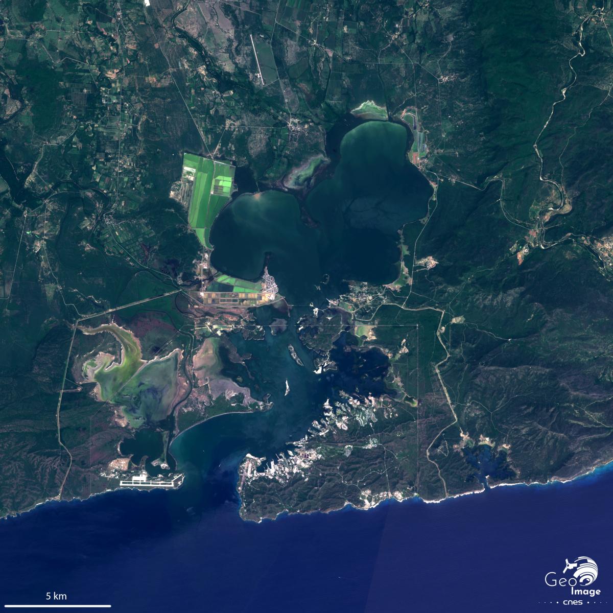 Pero el hecho más relevante de la imagen es sin duda la presencia de una gran bahía que se extiende a 15 km al sur de la ciudad de Guantánamo. Bien visible en el centro de la imagen, es la bahía de Guantánamo. Ésa es una de las escasas grandes bahías de refugio de todo el espacio caribeño, una baza mayor para implantar en ella una base naval.