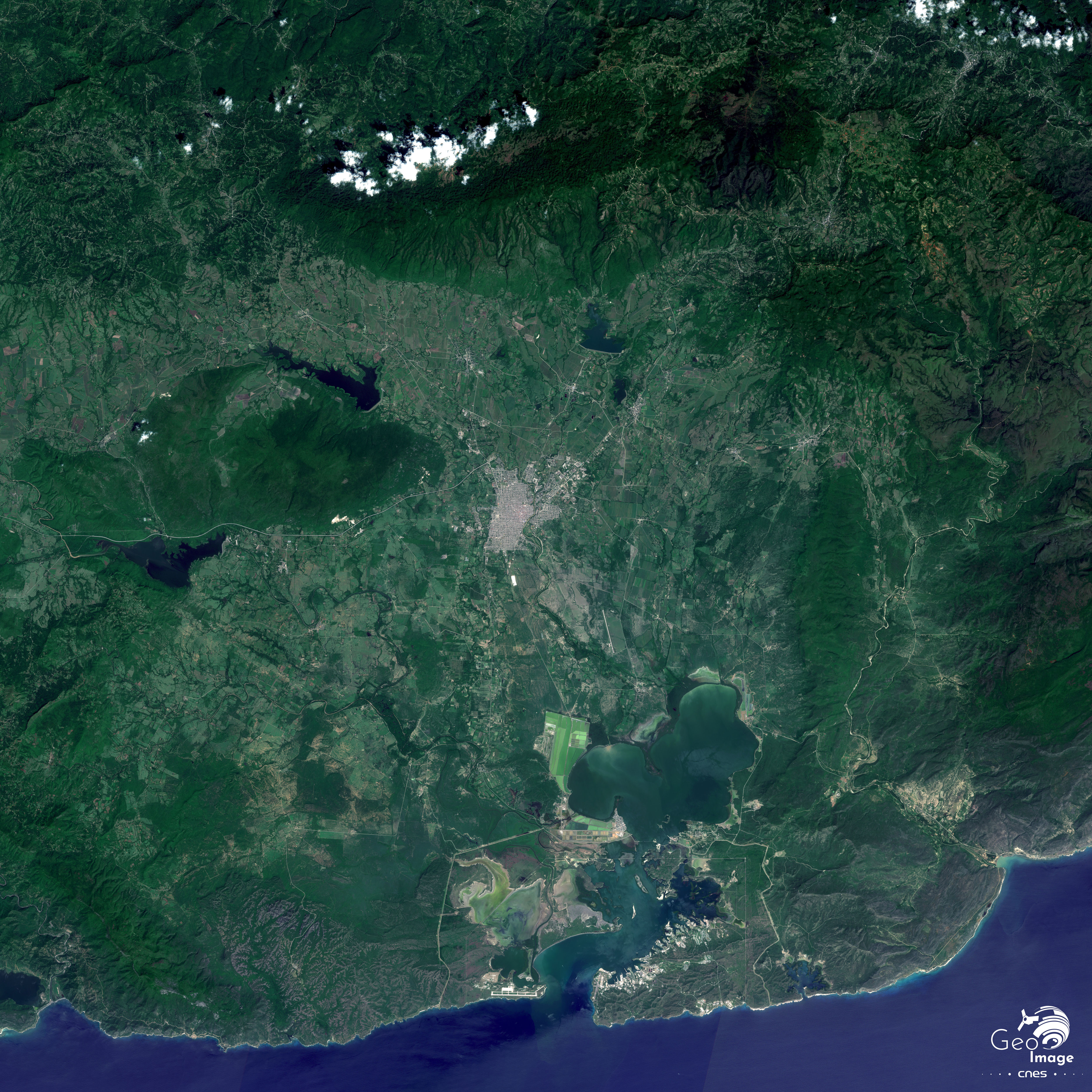 Cette grande ville polarise en fait, au delà de l’échelle de l‘image, une vaste cuvette entourée de moyennes montagnes drainées par plusieurs fleuves se jetant dans la mer, comme le Rio Guantanamo dont le cours est bien visible dans l’ouest de l’image. Au plan agricole, la cuvette est bien mise en valeur par de nombreuses cultures spéculatives (canne à sucre, café, tabac, coton…) et d’importants salines, bien visibles sur l’image. La région se caractérise globalement par un climat tropical marqué par une certaine aridité du fait de températures élevées (entre 31°C et 22,5°C) accompagnées cependant de faibles précipitations (62 cm/an). Mais elle est parfois marquée par le passage de puissants cyclones.