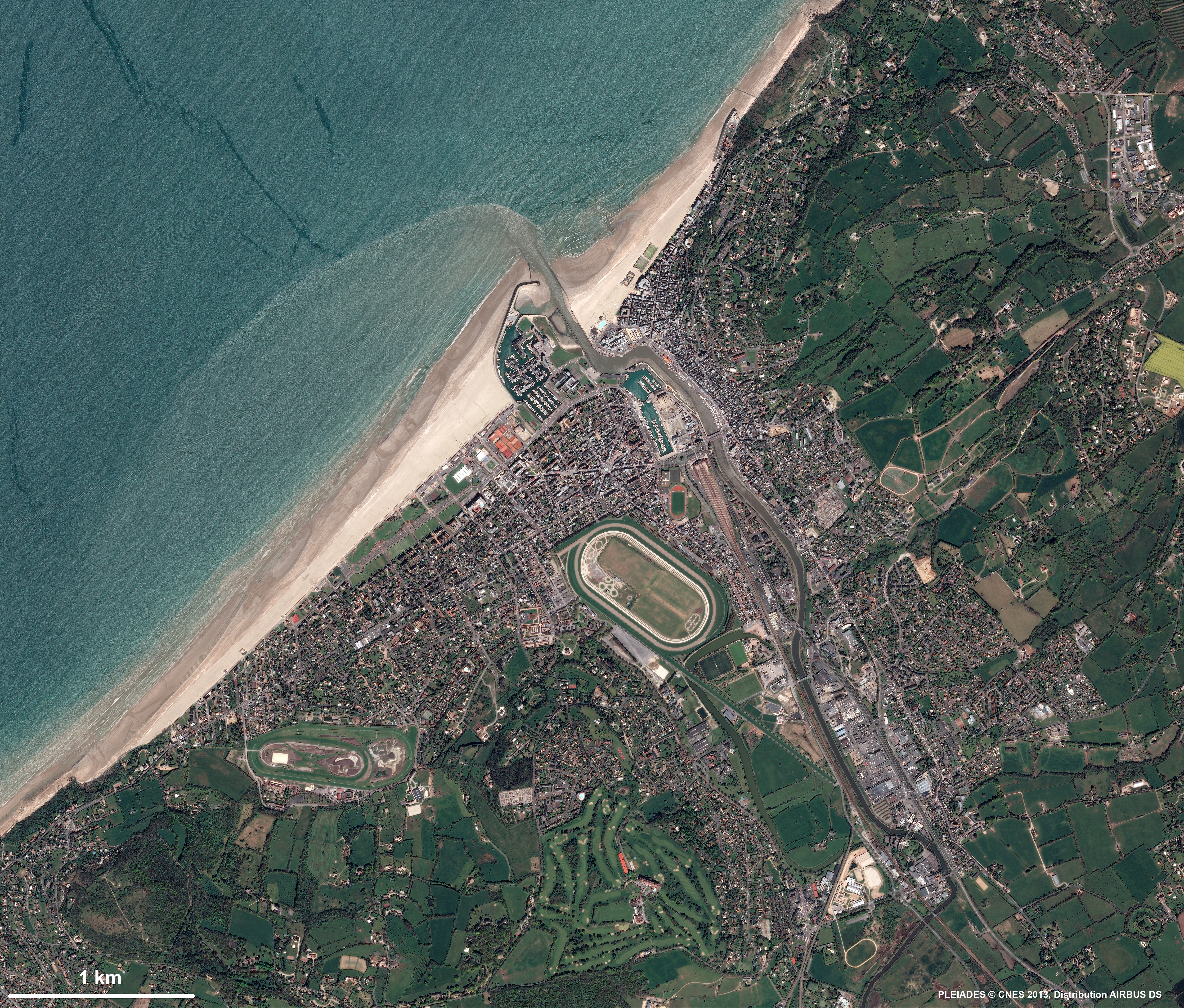 D’orientation sud-ouest / nord-est, la portion de littoral visible sur cette image est coupée verticalement par le bassin versant de la Touques, petit fleuve côtier séparant Trouville (sur la rive droite) de Deauville (sur la rive gauche), identifiable par ses deux hippodromes et son plan en damier, véritables géomarqueurs de cette station. L’estuaire de la Touques est ainsi intégralement englobé dans la matrice urbaine, sa zone d’accrétion sablo-vaseuse à l’embouchure du fleuve ayant pratiquement disparu en raison de nombreux aménagements.