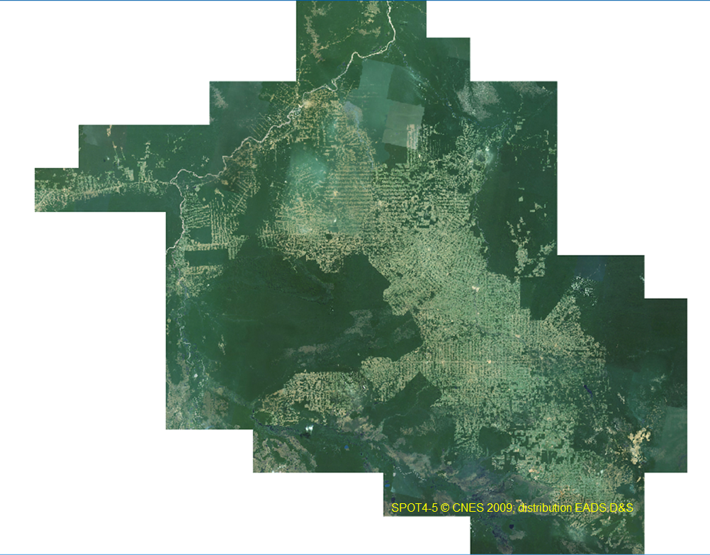 Cette image est une mosaïque d'images satellitaires correspondant à des données des satellites SPOT4 et SPOT5 sur l'Etat du Rondônia. Cette mosaïque a été réalisée en 2009 et sera confrontée dans cette fiche à des données satellitaires Pléiades plus récentes datant de 2015 (la zone d'étude principale correspond à la zone A sur l'image ci-dessus).