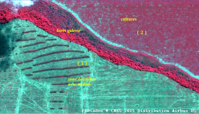 Entre la zone en cours de défrichement et celle en culture, une forêt galerie longe le cours d’un rio. Les arbres apparaissant en violet sont dans la partie la plus marécageuse le long du rio.