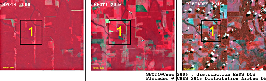 L’image Pléiades a été acquise en 2015, année de pleine reprise de la déforestation. Son positionnement sur l’image SPOT 4 de 2006 est localisé dans la partie où a lieu le défrichement en grands parcellaires. Les vignettes ci-dessous mettent en évidence la réalité du défrichement et l'impact du développement de l'activité agricole sur les terres de forêts.