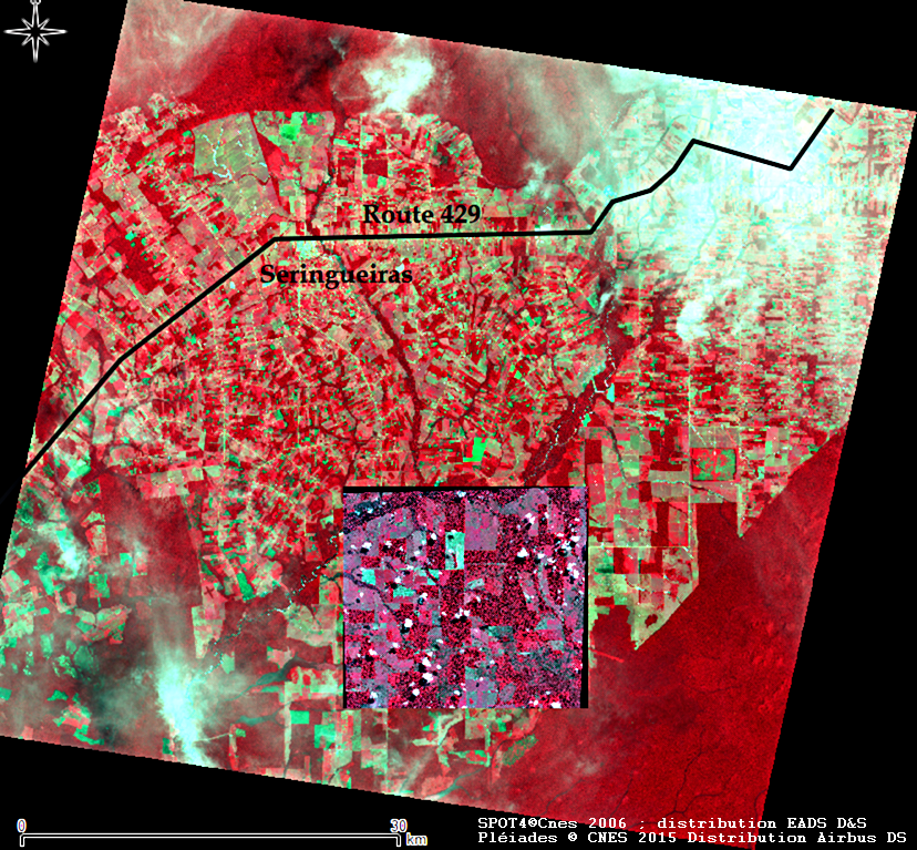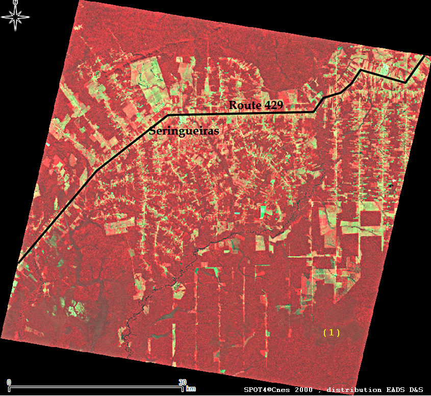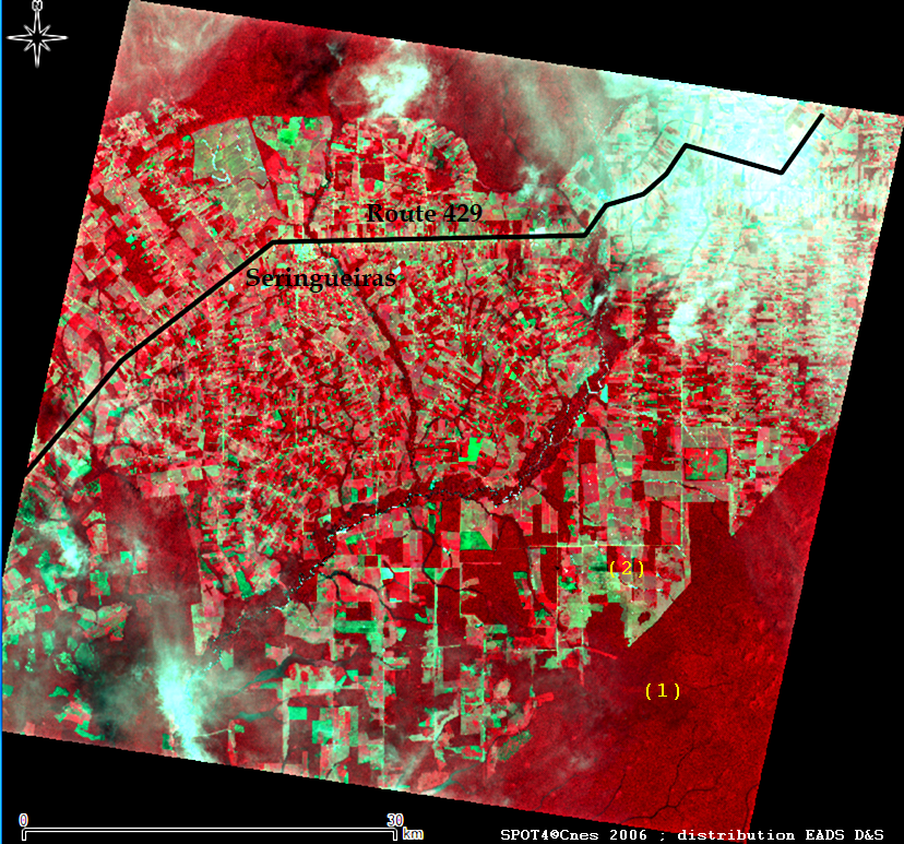 L’analyse comparée de deux images SPOT4 de 2000 et 2006 de la région de la ville de Seringueiras montre une déforestation quasi-totale en 2006 avec mise en culture ou en pâture, et des lambeaux forestiers subsistants essentiellement le long des fleuves, et en limite de la réserve naturelle (zone 1).