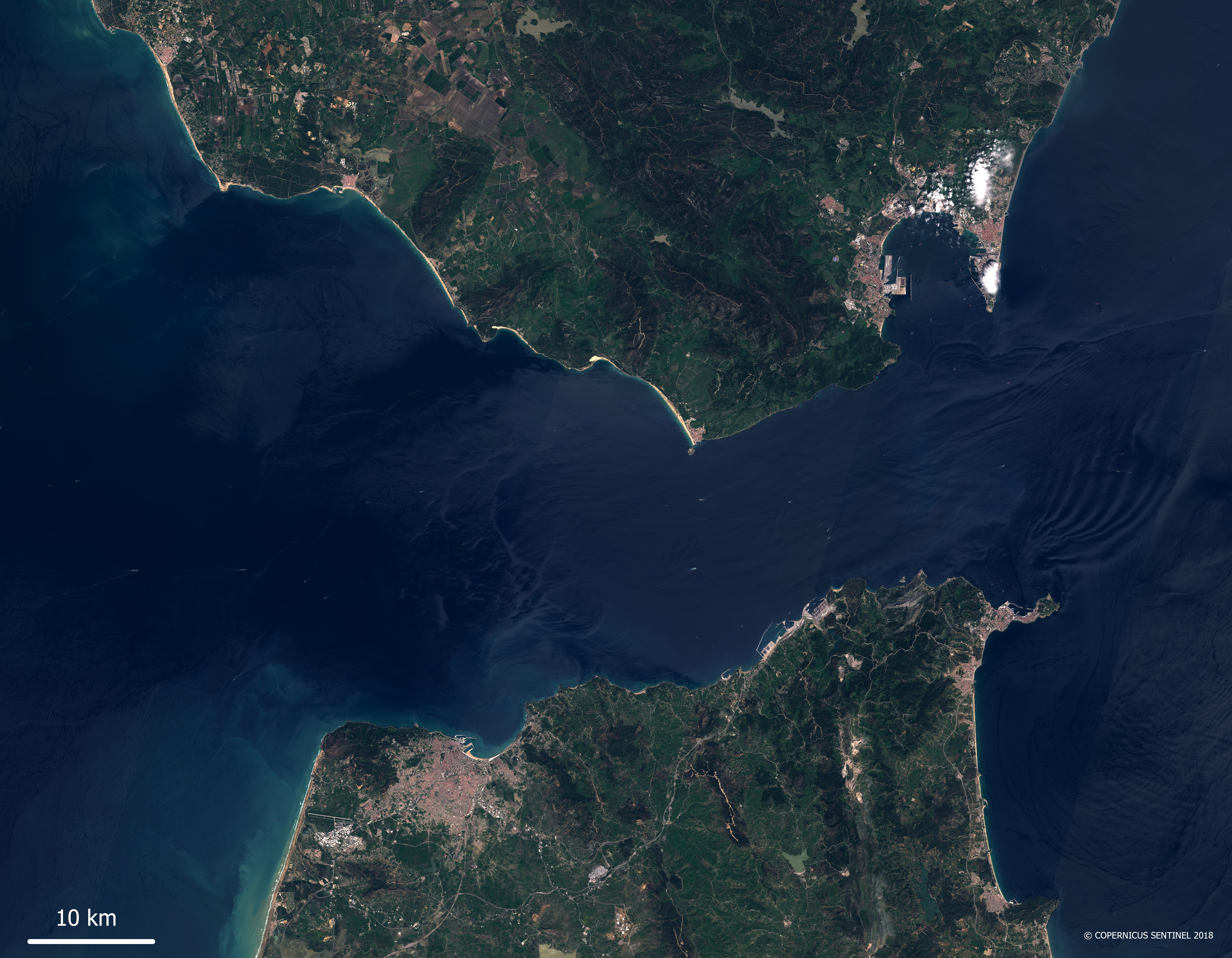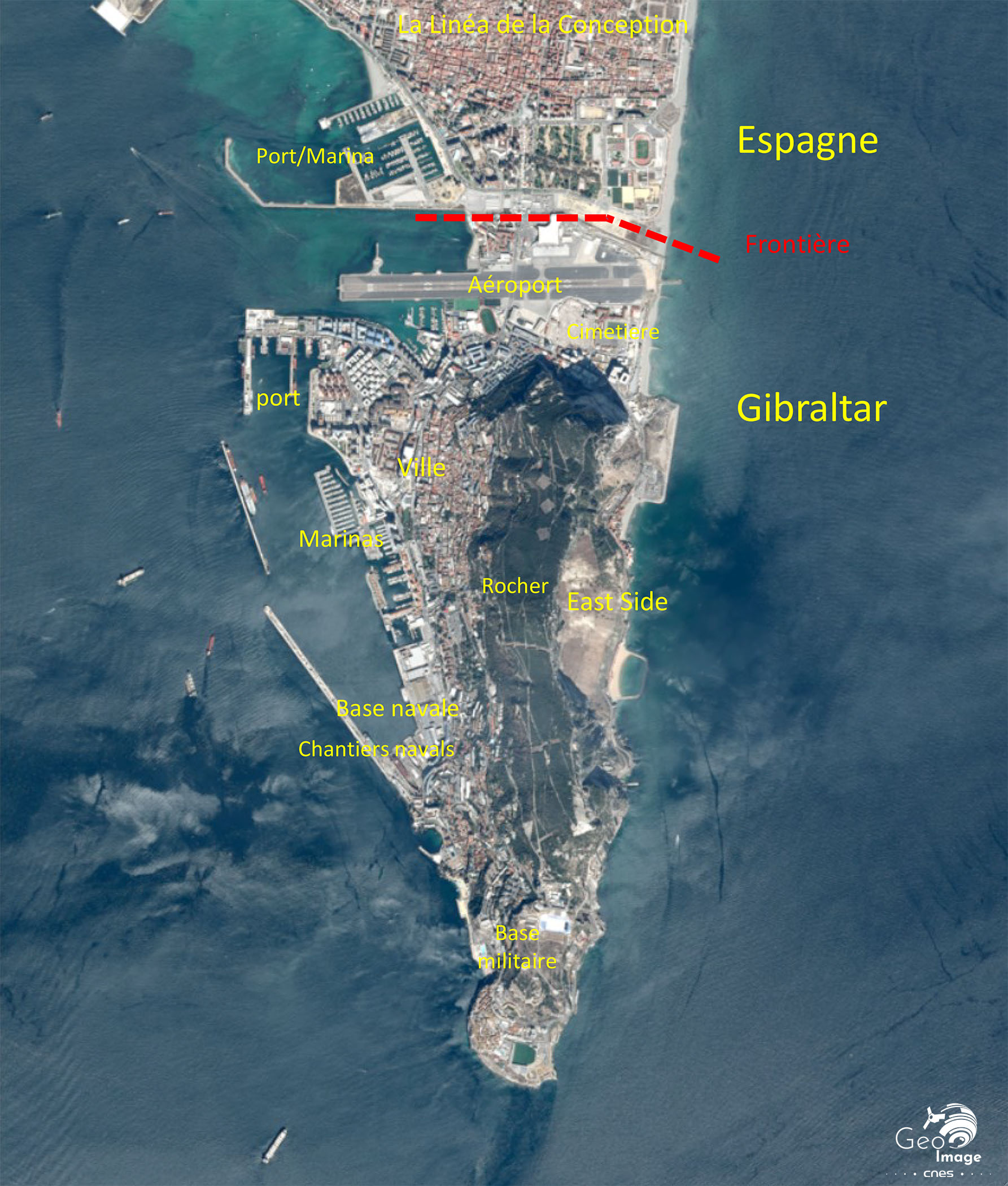 Cette image témoigne de la structure très particulière du détroit de Gibraltar. Au nord se trouve l’Espagne qui s’avance vers le sud par la Punta Marroqui et la ville de Tarifa au centre de l’image. Au nord-est, côté Méditerranée, se trouve un site exceptionnel bien visible : une vaste baie bien abritée et fermée par un puissant cap. Elle accueille le port d’Algéciras et, surtout, la Puntas Europa et le rocher de Gibraltar, sous souveraineté britannique.