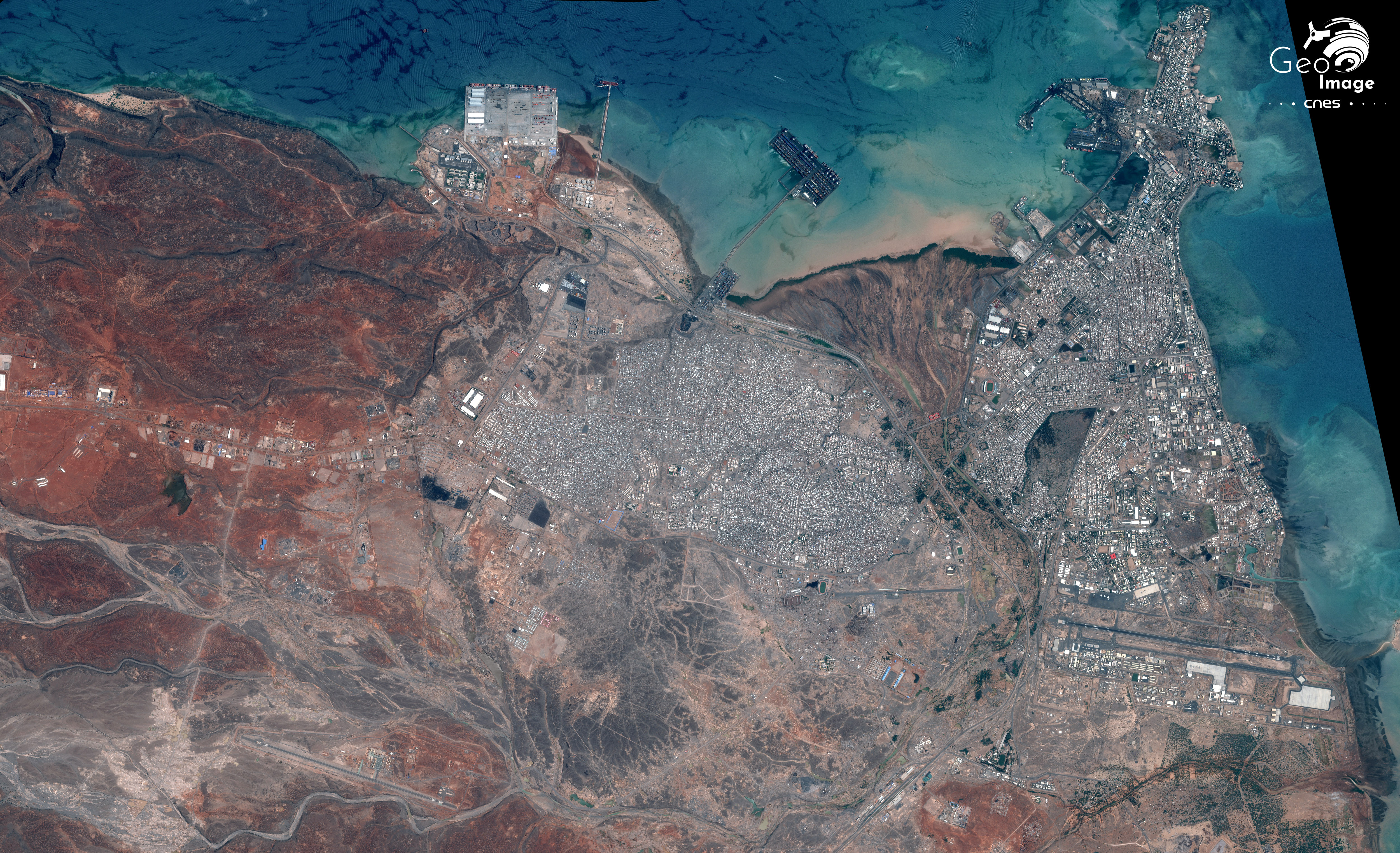 Situé sur la côte ouest de la mer Rouge, cette image de Djibouti a été prise par un satellite Pléiades le 23/05/2018. Il s’agit d’une image en couleurs naturelles, de résolution native à 0,70m, ré-échantillonnée à 0,5m .