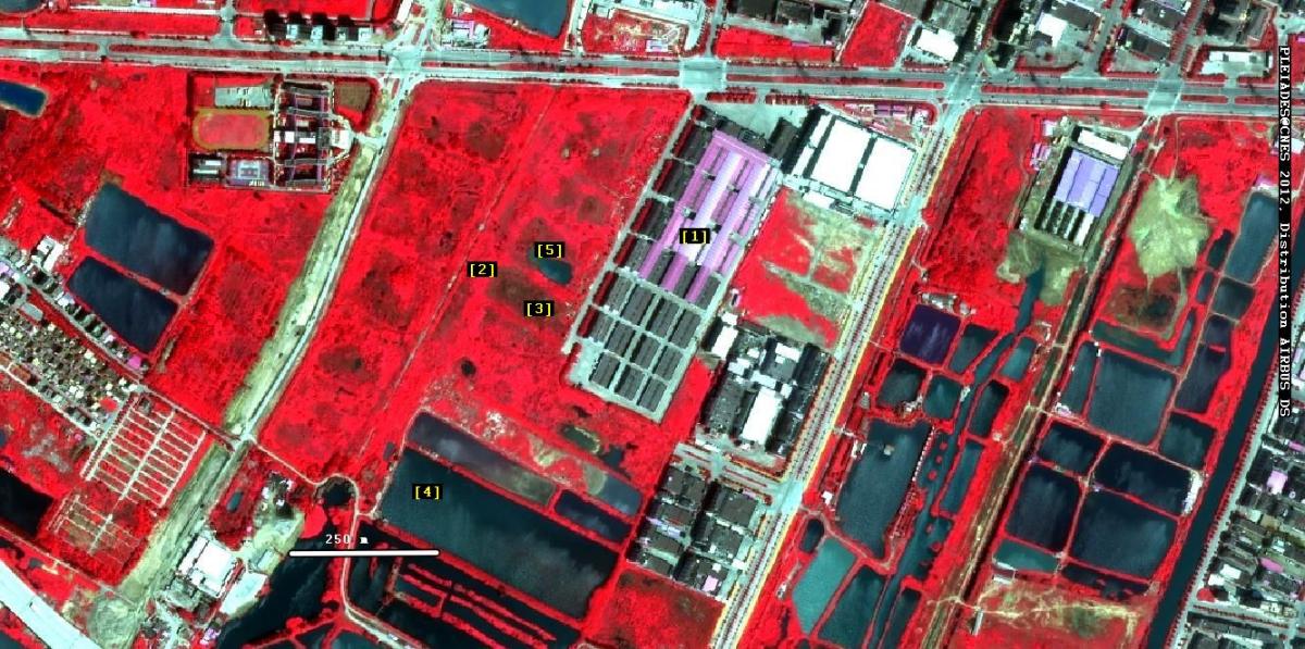 Sur cette image en composition colorée Proche - infrarouge, on relève les informations suivantes : une zone industrielle nouvelle (1),  un  ancien chemin de contournement d’un bassin aquacole (2), un ancien bassin comblé par un remblai (3). L’ancien bassin comblé est reconnaissable à sa couleur plus sombre : cela signifie que le sol est plus humide en raison de son ancien usage piscicole. La présence de  bassins non encore comblés (4)  ou en cours de comblement (5) est avérée.
