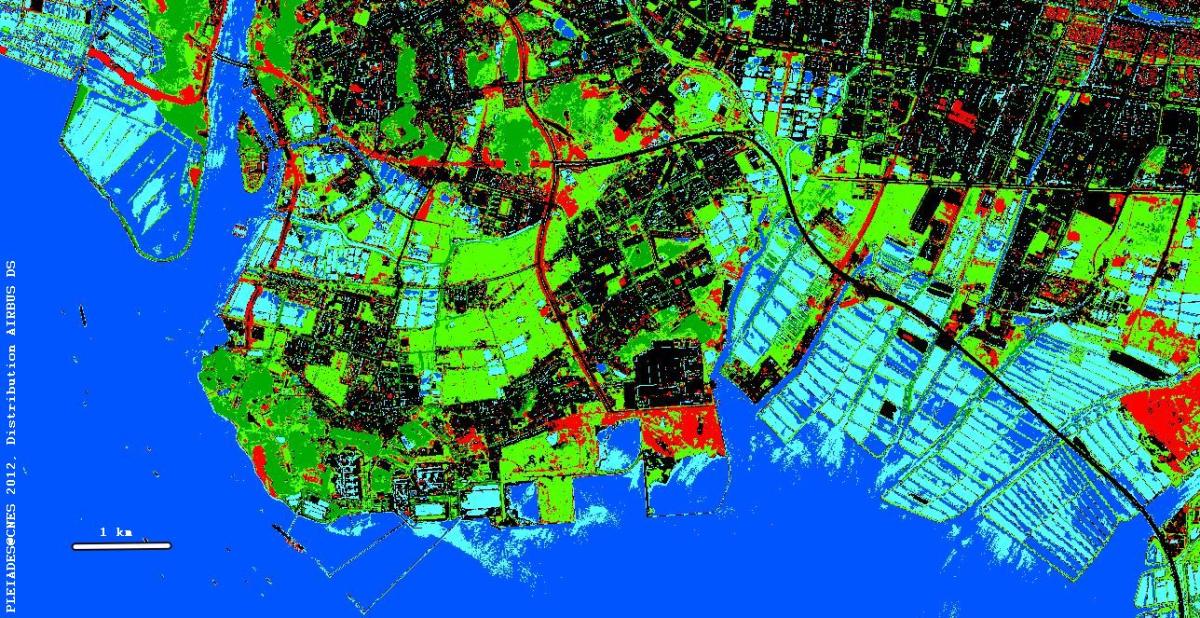 Sur cette classification supervisée, le logiciel permet de déterminer les différents types d’occupation des sols dans cette région de la rivière des Perles. Les statistiques générées par le logiciel précisent que près de 10% de la superficie de l’image sont en cours d’artificialisation (couleur rouge). On note en particulier, la réalisation des grands axes de communication autoroutiers (toutes les lignes rouges). On remarque également que l’artificialisation est plus importante à proximité des terres d’exploitation agricoles ou sur les bassins aquacoles. Les espaces forestiers sont moins soumis à ces processus d’urbanisation accélérée puisqu'ils n’occupent que des zones  de collines : leur déboisement rendrait l’occupation dangereuse en raison des risques de glissements de terrain.
